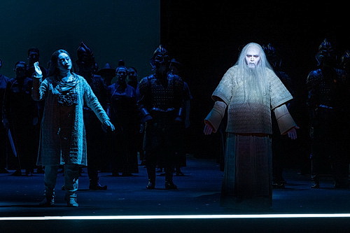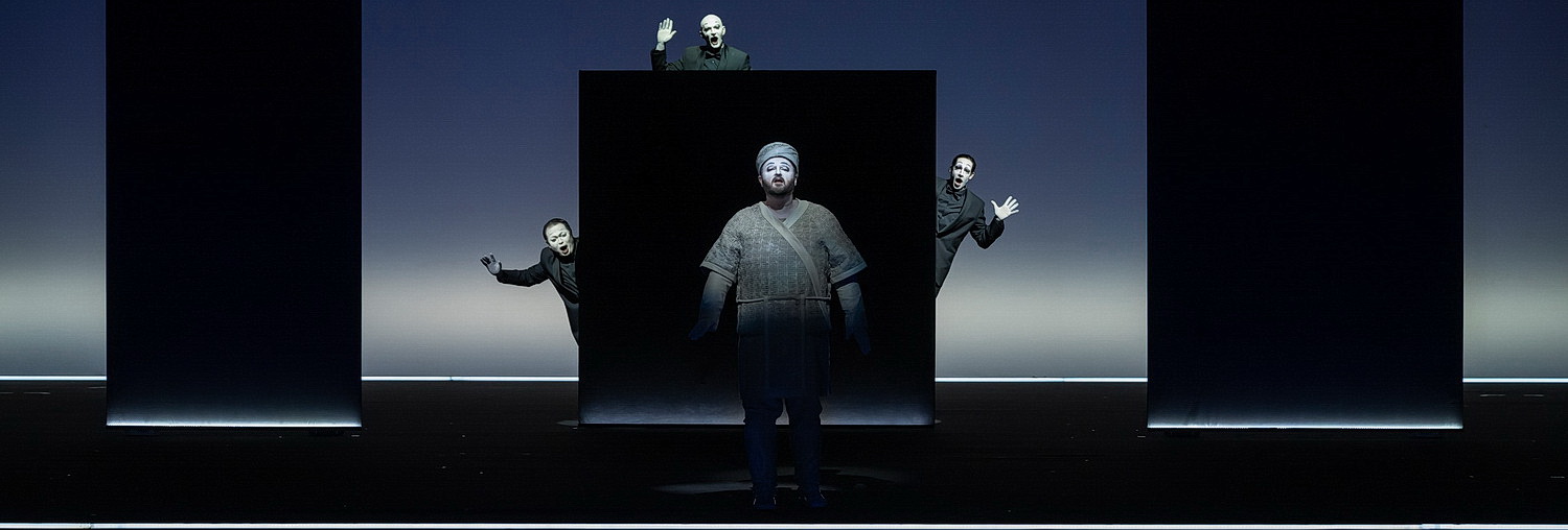 Sopranistin Elena Pankratova ist unnahbar statisch, wie es sich gehört. Sie singt im zweiten Akt sehr eindrucksvoll die Geschichte der misshandelten Vorfahrin, die sie durch ihre unerbittliche Jungfräulichkeit zu rächen sucht In questa Reggia, um daraufhin ihre drei Rätsel aufzugeben. Ihre Stimme gewinnt eine gewaltige Dramatik im Schlussduett mit Calaf, in der ihre Unnahbarkeit einer unwiderstehlichen Liebessehnsucht weichen soll. Und hier übernehmen einzig ihre Stimme und das Orchester die Überzeugungskraft, denn die Regie ist weiterhin statisch: Die beiden Hauptdarsteller berühren einander kaum, und doch soll der sinnliche Funke überspringen. Eine sehr freudige Überraschung ist die Sopranistin Guanqun Yu als die selbstlose Sklavin Liù, der Puccini die eigentliche Hauptrolle zugesteht. Ihre mezza-voce ist betörend und das aus dieser mezza-voce herauswachsende crescendo, in der Szene im dritten Akt, in der sie sich den Tod gibt Sì, Principessa, ascoltami!, sehr ergreifend. Man findet hier den Puccini der Madama Butterfly wieder. Gwyn Hughes Jones‘ Timbre leuchtet in den Höhen seines Belcanto-Tenors, aber hat in der Rolle des Calaf etwas Schwierigkeiten in den mittleren und tieferen Lagen. Oder ist er indisponiert? Die Rolle des gestürzten Königs Timur singt und spielt Vitalij Kowaljow sehr einleuchtend. Ebenso ist Carlo Bosi auf seiner Himmelsschaukel ein würdiger Kaiser Altum in Un giuramento atroce. Wie schon erwähnt, verdienen als das singende perpetuum-mobile-Trio Ping, Pang und Pong Allessio Arduini, Mathew Newlin und vor allem Jinxu Xiahou, der wie eine wandelnde Maske wirkt, ein besonderes Lob. Bogdan als Mandarin klärt uns, Popolo de Pekino, mit sonorer Stentorstimme gleich zu Beginn der Oper über das grausame Gesetz im Kaiserreich China auf.