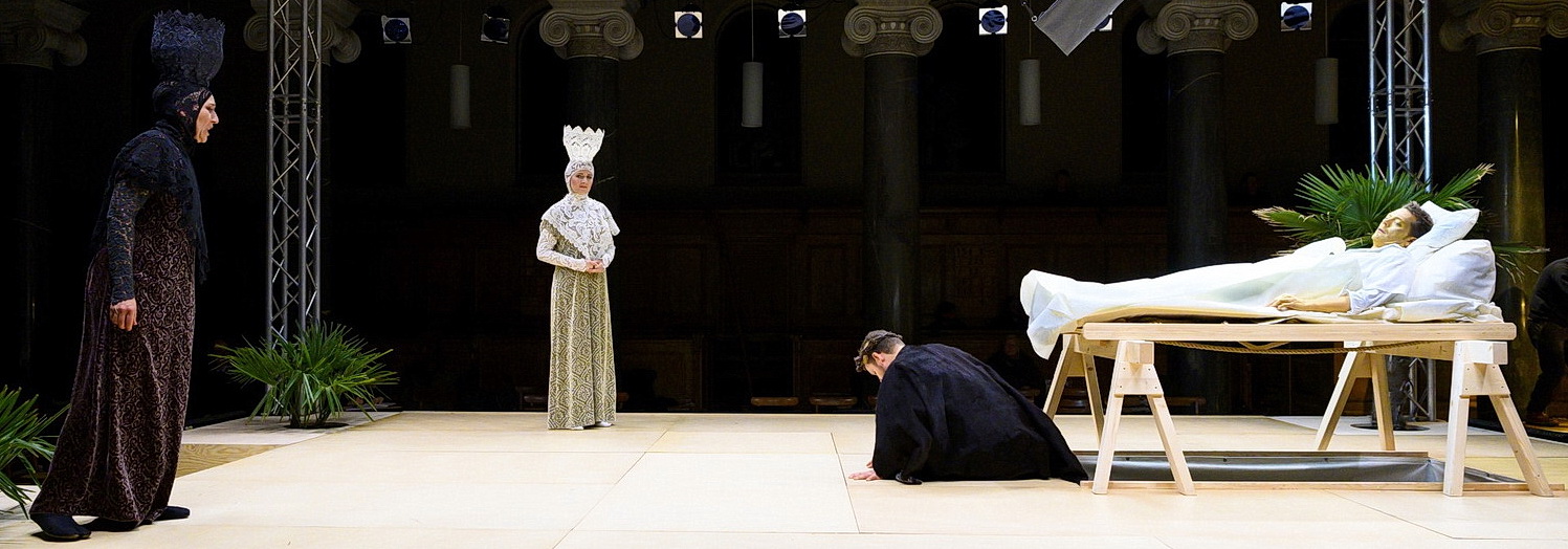 Im Zentrum der Kirche befindet sich eine erhöhte Spielfläche, überspannt von einem Baldachin. Ein paar Palmen deuten die orientalische Umgebung an. Hier liegt Lazarus auf einer Bahre, umgeben von seiner Familie. Der Regisseur Frederic Wake-Walker, der gleichzeitig die Ausstattung verantwortet, lässt das Publikum daran teilhaben, wie die Angehörigen den Sterbeprozess bis zum Tod begleiten, zur letzten Station wird die Grablegung. Die Aktionen sind sparsam, die Personenregie ist dezent, meist wird ergriffen herumgestanden.