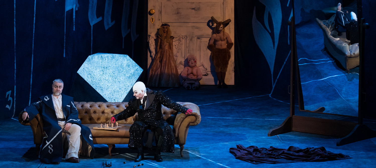 In der Regie von Michael Sturm spielen weder politische noch gesellschaftliche Dimensionen eine Rolle und auch nicht ein pittoreskes Nürnberg. Sturms Inszenierung will eine Reflektion über Kunst sein. Dafür hat Matthias Engelmann einen blau ausgeschlagenen, nach hinten sich verengenden Raum entworfen, den eine übergroße weiße Tür abschließt. Zahlreiche allegorische und mythische Figuren bevölkern die Bühne, auch lebendig gewordene Kunstwerke, wie Albrecht Dürers Adam und Eva und eine Putte aus seiner Melancolia. Selbst Wagner ist in persona präsent. Erst beim vergeblichen Versuch, als Statue einen Sockel zu erklimmen, später nur als abgeschlagener Kopf, wie das Haupt des Jochanaan, auf dem Boden liegend.