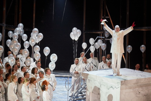 Vieles ist verrätselt an diesem Abend. Beckmesser erscheint wie ein Zauberer in schwarzglitzerndem Mantel, während Eva mit flammend roten Zöpfen und übergroßer Schleife und Walther, der wie ein Naturbursche agiert, in ihrer Aufmachung an Kasperletheater erinnern. Hingegen tragen die Meister Gesichtsmasken und rote Hände, sind genauso entindividualisiert wie der einheitlich gewandete Chor: rot in der Kirche und weiß beim Festbild. Nur Sachs ist ein Mensch aus Fleisch und Blut, der durch Kunst Neues bewegen will. Aber vergeblich. Zur Schlusshymne beginnen alle im Gleichschritt zu marschieren, während Sachs verzweifelt in der Menge verschwindet. Vielleicht war ja alles nur ein Hirngespinst des Schusters oder gar Wahnsinn. Dieses Wort nämlich, zweigeteilt in Wahn und Sinn, leuchtet während der ersten zwei Akte in großen Buchstaben von den Wänden herab. Die Inszenierung bietet starke optische Reize und schafft einen künstlichen, symbolreichen Kosmos, der für unterschiedlichste Fantasien und Assoziationen offen ist. Nur: Eine Geschichte wird nicht erzählt. Was zur Frage führt, ob solch gedanklich überfrachtete Inszenierung für ein Publikum, das das Werk erst kennenlernen muß, als Einstieg geeignet ist.