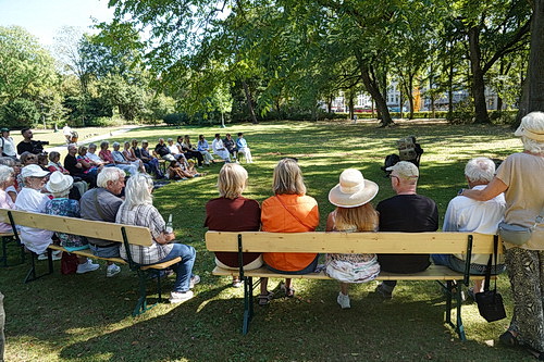 Das Festival hatten Küppers und ihr Team bei seiner ersten Ausgabe bewusst klein angelegt, um erste Erfahrungen zu sammeln. Schon am Samstag zeigt sich, dass es gern etwas mehr hätte sein dürfen. Und das wird auch für den Sonntag gelten. Wieder bei fantastischem Sommerwetter findet die zweite Aufführung diesmal neben einer Bühne, die sich hier Pavillon nennt, statt. Die Erwartungen sind nicht allzu hochgeschraubt. Ein Tanzduo auf einer Parkbank. Hm. Immerhin. Die Sitzbänke, die im Halbkreis um eine Parkbank aufgestellt sind, sind zu Beginn bis auf den letzten Platz besetzt, und für die Kinder sind Decken vor den Bänken ausgelegt. Schließlich will sich das Festival an alle von 7 bis 77 richten. Ein Mann mit verfilzten, grauen Haaren läuft herum und preist Programme auf Italienisch an: ein großes, ein kleines und eins fürs Internet. Zwischendurch wird er laut. Dann hat er in der Ferne Parkbesucher entdeckt und will sie herbeirufen. Als erfahrener Straßenkünstler weiß man, dass man vorbeilaufende Menschen durchaus mit persönlicher Ansprache noch zum Verweilen einladen kann. Schließlich taucht noch eine Mitarbeiterin mit einer weiteren Gästeschar auf, die sie am Theatermuseum eingesammelt hat. Und dann kann es losgehen.
