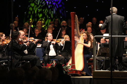 Bereits im November vergangenen Jahres hatte Gabrisch seine Tochter Maria Luisa mit einem Harfen-Solo aus Camille Saint-Saëns Oratorio de Noël vorgestellt. Und mit ihrem Spiel das wenig fachkundige Publikum begeistern können. Im Sommer dieses Jahres legte Maria Luisa den „Fachkundenachweis“ nach: Im Bundeswettbewerb Jugend musiziert belegte sie den ersten Platz. So ganz trittfest will die 17-Jährige noch nicht auf die Bühne, aber kaum sitzt sie am Instrument, strahlt sie das Urvertrauen in den Vater und ihre eigenen Fähigkeiten aus. Hochkonzentriert und auswendig produziert sie serienweise schöne Läufe. Da wächst ein ganz großes Talent heran, und die Bürger seiner Heimatstadt dürfen es „hautnah“ erleben. Das ist schon etwas Besonderes. Und hat auch durchaus Weihnachtliches, wenn der Vater seine Tochter nicht freundlich als Solistin verabschiedet, sondern impulsiv vom Pult steigt und sie in den Arm nimmt. Nach Denn es ist uns ein Kind geboren und dem passenden Abschluss mit dem Hallelujah aus Händels Messiah geht es in die Pause.