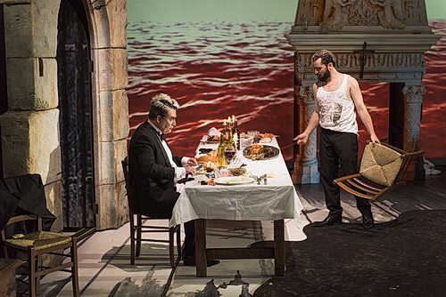 Da sitzt er, im feinen Zwirn, an einer festlich dekorierten Tafel mit sechs Gedecken, leicht flackern die Kerzen in den Leuchtern, noch sitzt der befrackte Herr Professor allein am Tisch und tafelt schweigend vor sich hin. Möchte man ihm da nicht Gesellschaft leisten, wie er da offensichtlich im Überfluss speist und sich langweilt? Der Gedanke verschwindet schnell, wenn man von ihm im Selbstgespräch und später, im Tafelgespräch mit drei weiteren Herren und zwei Damen erfährt, was ihn, was sie alle umtreibt: Ein Zug von fast einer Million Flüchtlingen aus Indien hat sich in Booten auf den Weg gemacht und schickt sich an, in Europa, genauer in Frankreich, an Land zu gehen, um dort ein neues, ein besseres Leben zu suchen und zu finden. Da bleibt selbst dieser versteckte Ort in den Schweizer Bergen kein „sicherer“ Ort mehr, obwohl der Flüchtlingstreck bis jetzt absolut friedlich verläuft. Doch diesem Frieden traut die hier versammelte „bessere Gesellschaft“ nicht, die sich im „Heerlager der Heiligen“ eine – hoffentlich – sichere und komfortable Bleibe eingerichtet hat und die Frage diskutiert: „Was können, was müssen wir tun?“