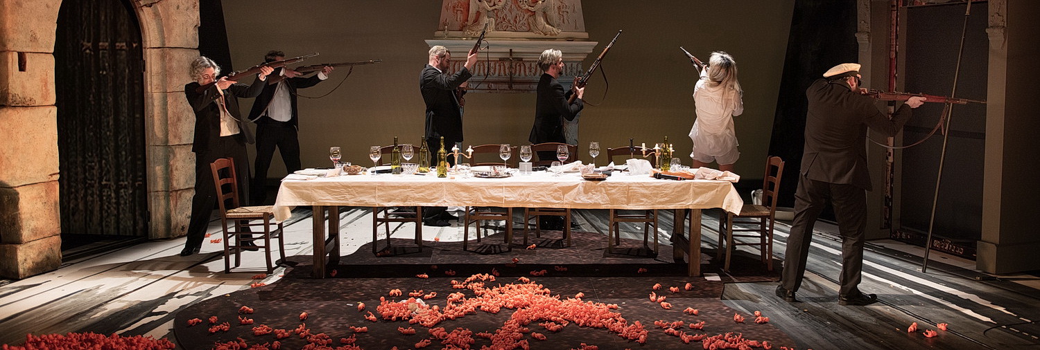Und so lässt er in seiner Inszenierung einer „extrem fremdenfeindlichen Fantasie“ alle „Instrumente“, alle Methoden und Argumente auftreten, die das rechte Spektrum heute anbietet. Von der Entwicklung einer „Willkommenskultur“ über Internierungen und Isolierungen bis hin zur Zurückweisung und – ja, auch das – Vernichtung durch Erschießen. Es gibt nichts, keine Variante der Abgrenzung und Abschottung, die das „Heerlager“ der sich verwöhnenden, weißen Wohlhabenden nicht zumindest heftig diskutiert und in Erwägung zieht und in der Geschichte als Anschauungsfeld nicht schon findet. Und so kann es eigentlich den Zuschauer nicht überraschen, dass als Dauerschriftband auf einem Fernseher ständig der Schriftzug „Der nationale Gedanke“ durchläuft. Es überrascht eher, dass dann gegen Schluss doch noch ein Uniformierter die Ausführung des Schießbefehls verweigert. Doch da wandelt sich das „Heerlager der Heiligen“, derjenigen, die sich auf der goldenen Seite des Lebens eingerichtet haben, in ein tatsächliches Heerlager. Die um ihren Sekt und den Kaviar bangenden Tafelgäste halten plötzlich alle Gewehre in der Hand, die sie sich von Personal haben reichen lassen, und erleben selbst das, was ihnen ihr „Sicherheitspersonal“ verweigerte.