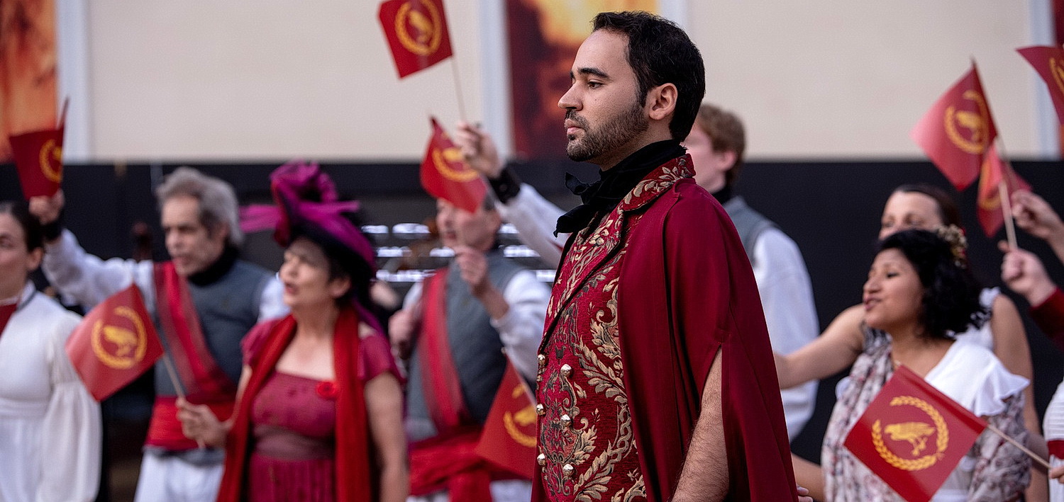 Unverstärkt und ohne Dach kämpft das Ensemble der Kammerakademie Potsdam hinter den Sängern um Balance und Gehör. Da kann die Leitung von Markellos Chryssicos noch so charismatisch sein, aber die Brillanz und Energie von Cimarosas melodischen Erfindungen und seinen lebhaften Motiven will nicht ganz gelingen. Sicherlich wird die Kammeroper hierfür in den nächsten Jahren eine bessere Lösung finden. Da haben es die Sänger leichter, da sie den gesamten Vorhof nutzen können – mal sind sie von einer hinteren Balustrade, mal von den hohen Türmen, mal sogar hinter dem Publikum zu hören. Unterstützt werden sie vom Apollo-Chor der Staatsoper Unter den Linden, der einfühlsam in der Einstudierung von Artur Grywatzik das gemeine Volk beider Parteien verkörpert.