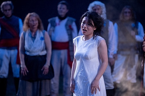 Die Regie von Quander siedelt die Oper in der Epoche ihrer Entstehung an – nach der französischen Revolution mit Roben und Perücken von Barbara Krott – die sich gut in das Friderizianische Ensemble von Rheinsberg einfügt. Dramaturgisch beschränkt sich die Regie auf die Auf- und Abtritte des Chores und einige, wenige dramatische Hinweise für die Sänger. Dazu gehört das Machoauftreten des Tenors Wagner N. S. Moreira als Marco, der mit einem fast baritonalen Timbre überzeugt, und die sensible Interpretation des Countersoprans Samuel Mariño. Seine außerordentliche Tessitura hat die Fähigkeit, sein Publikum mit einem warmen Schmelz völlig zu verzaubern. Sopran Shixuan Wei verkörpert die Rolle der hin- und hergerissenen Tochter und Braut Orazia voller Inbrunst und authentischer Überzeugung, wie auch melodischer Stimmfärbung und glasklaren Koloraturen. Die kleineren Partien lassen aufhorchen und der Rheinsberg-Akademie zu einer guten Auswahl in diesem Jahr gratulieren.
