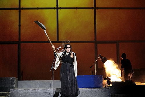In einer großen kahlen Halle des Duisburger Landschafts­parks, der ehema­ligen Kraft­zen­trale, hat das Team der Ruhrtri­ennale eine Zuschau­er­tribüne montiert und davor auf einem Podest eine große Spiel­fläche für die Akteure aufgebaut. Hinter der angedeu­teten Holzsil­houette, einer „Baustelle in progress“ hat Christian Fried­länder mit wenigen Versatz­stücken die Orte des Geschehens angedeutet. Außerdem spielen die von Adrien Lamande verant­wor­teten Video­ein­spie­lungen eine wichtige Rolle in dieser Aufführung. So merken die Zuschauer zu Beginn erst nach genauerem Hinsehen, dass die einge­spielte Video­szene einer Ausgrabung die zwei Gestalten sind, die sich in einer Art Sandkasten mit Pinsel und Schäu­felchen darum mühen, Relikte aus dem Sandbett frei zu legen und „Geschichte“ zu finden: Juno und Jupiter, weit entfernt von göttlichem Glamour, wühlen in den Relikten der Zeit, schaben und pinseln – und stoßen zunächst auf eine Mosaik­scherbe, die sich bei näherer Prüfung als Bild auf einem Handy entpuppt. Weitere Indizien der digitalen Welt kommen zum Vorschein wie eine PC-Maus, ein Wirrsal von bunten Drähten … Die Götter schauen in die Zukunft, indem sie zurück blicken. Hier wie an anderen Stellen gehen die Zeitlinien der verschie­denen Handlungs­stränge bunt durch­ein­ander, Marton überlässt es dem Zuschauer, sich seine Welt selbst zu ordnen. „Dass die Zeit in Schlaufen verläuft“, ist nicht eine Erfindung der Regie, sondern physi­ka­lische Erkenntnis.
