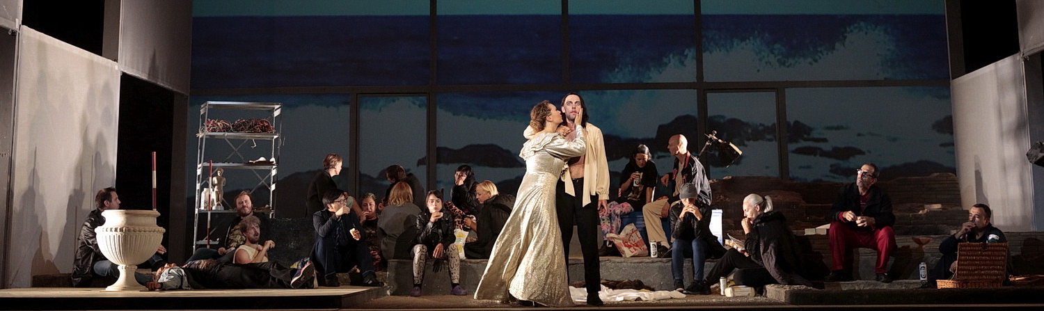 Was muss jemandem wider­fahren, dass er den Tod einen „willkom­menen Gast“ nennt, dem es einfacher scheint zu sterben als zu leben. Da spielt die Liebe ihr vielge­sich­tiges Spiel, da geht es um politische Macht, da fühlt sich der aus Troja stammende Aeneas zwischen dem Götter­ver­sprechen und der verlo­ckenden Dido hin- und herge­rissen, da geht es um den antiken Streit zwischen Trojanern und Römern, um ein politisch noch nicht einge­löstes Versprechen, an das Aeneas immer wieder erinnert wird – remem­bered. Um all diese Grund­pro­bleme des einfachen Lebens, die den Alltag mal fantas­tisch, mal unerträglich machen, hat David Marton für die Ruhrtri­ennale in ein spannendes, teils histo­risch angelehntes Szenario, mal in den Sand des Mittel­meers, mal in unsere Digitalwelt zwischen Handy und Kabel­salat einge­woben. Er versucht einen Spagat zwischen der antiken Geschichte um die Königin Dido und den Helden Aeneas und den politi­schen Problem­zonen unserer Zeit, der weitgehend gelingt.