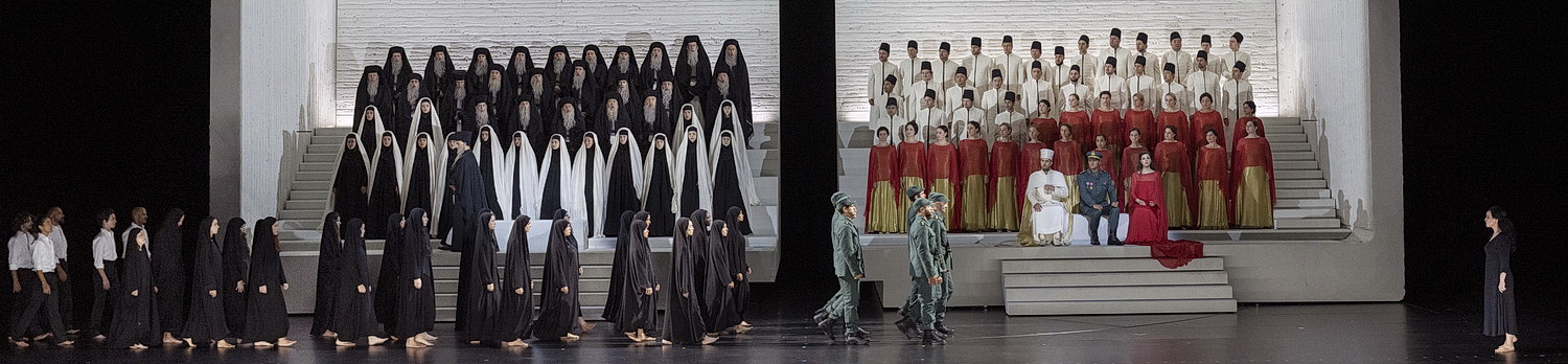 Zudem gibt es in den Umbau­pausen Porträts von zerfurchten Gesichtern, die von gebets­ar­tigem Geflüster begleitet werden. Offenbar sind das Reminis­zenzen an ihr Heimatland. Ein Triumph­marsch findet nicht statt. Da dreht sich der Würfel mehrfach um die Achse und gibt den Blick auf die in Reih und Glied sitzenden Priester mit falschen Rausche­bärten frei. Und im Krieg gibt es sowieso kein Erbarmen: Alle Gefan­genen und sogar Amonasro werden hinge­richtet. Radamès muss sich im Ritual die Hände in Blut waschen und eine Frau mit einem Schwert ermorden. Neshat zeigt hier die Geist­lichkeit als Ursache des Krieges und der Gewalt, offenbar wieder eine Anspielung auf die politische Situation im Iran. Zum Schluss werden Aida und Radamés nicht einge­mauert, sondern singen ihrem Ende entgegen, während ein Boot mit Frauen auf das Meer hinaus­treibt, angelehnt an die Flüchtlingsproblematik.