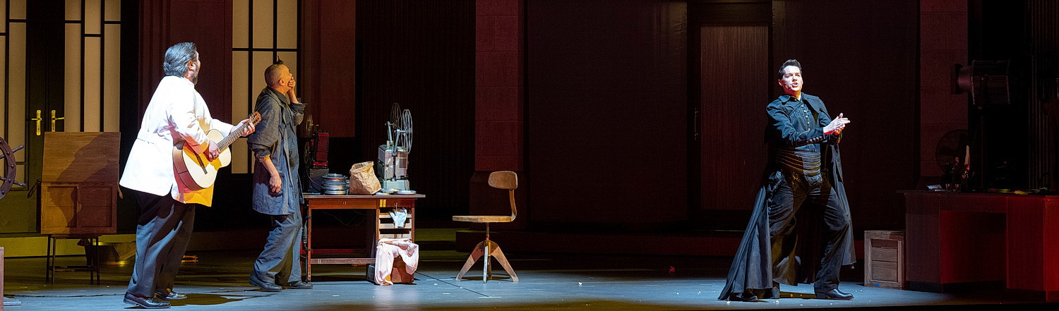 Er ist ein Tagträumer, der sich im Hollywood-Ambiente der 1930-er Jahre gerne in alte Filme flüchtet. Und er ist omnipräsent. Er holt nicht nur die Figuren aus den im Hinter­grund gezeigten Filmen heraus und lässt sie lebendig werden, sondern er beein­flusst auch wie ein Strip­pen­zieher immer wieder die Handlung und die Protago­nisten von Gioachino Rossinis Il barbiere di Siviglia, einem Klassiker des Opera-buffo-Genres, bei den Salzburger Pfingst­fest­spielen im Haus für Mozart. Arturo Brachetti verkörpert den vom Regisseur erfun­denen, stummen Verwand­lungs­künstler. Rund um die Rahmen­handlung zeigt der komik-affine Rolando Villazón in seiner Insze­nierung ein vielschich­tiges und intel­li­gentes Feuerwerk an unter­halt­samen Gags, Symbolen und unerschöpf­lichen Ideen, deren es aller­dings manchmal zu viel und zu absurd wird und die teils zu sehr in den Klamauk abgleiten. Da bevölkern Kinohelden wie Franken­stein, Nosferatu, Zorro, Western­helden, Römer, Kosaken, Samurai mit Anspie­lungen auf unzählige Filmklas­siker die Bühne. Und immer ist unglaub­liche Rasanz ohne Still­stand angesagt in immer wieder herein- und hinaus­ge­scho­benen Filmku­lissen von Häuser­fronten und Versatz­stücken – das Bühnenbild erdachte Harald B. Thor – in fanta­sie­vollen, teils abenteu­er­lichen Kostümen von Brigitte Reiffen­stuhl. Das Tempo kulmi­niert am Ende des ersten Aktes so stark, dass einer buchstäblich den Stecker ziehen muss, damit der Still­stand eintritt.
