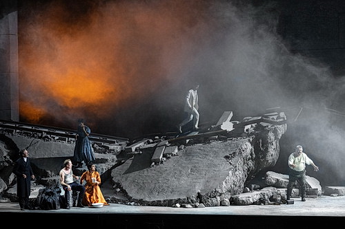 Die Bühne ist ein einziger Trümmer­haufen, als ob eine Bombe einge­schlagen hätte. Kaputte Gleise, die aus einem Tunnel kommen, spannen sich über die breite Bühne der Felsen­reit­schule. Dazwi­schen Beton­brocken, in der Mitte die Reste eines Spital­zimmers mit einem Krankenbett, daneben eine reglose Gestalt, an der ein Kind rüttelt, bald liegt eine alte Frau darin. Auf der Bühne von Rufus Didwiszus entzündet sich immer wieder an verschie­denen Stellen Feuer. Stumme, völlig zerzauste – für die Kostüme zeichnet Emma Ryott verant­wortlich – gezeichnete Figuren tauchen aus dem Nichts auf und torkeln zwischen der feinge­klei­deten Gesell­schaft herum. Die Protago­nisten langweilen sich, und es wird viel gesoffen: Das alles soll offenbar die Ereig­nis­lo­sigkeit der Provinz, das Leben als Warteraum, aber auch das stetige Fließen der Zeit spiegeln. Die Oper Tri sestri – drei Schwestern – von Péter Eötvös, basierend auf dem gleich­na­migen Drama von Anton Tschechow, beinhaltet ja auch genau dieses Thema: Drei Schwestern, die sich in der ereig­nis­losen Provinz fadisieren und unter anderem davon träumen, wieder nach Moskau zurückzukehren.