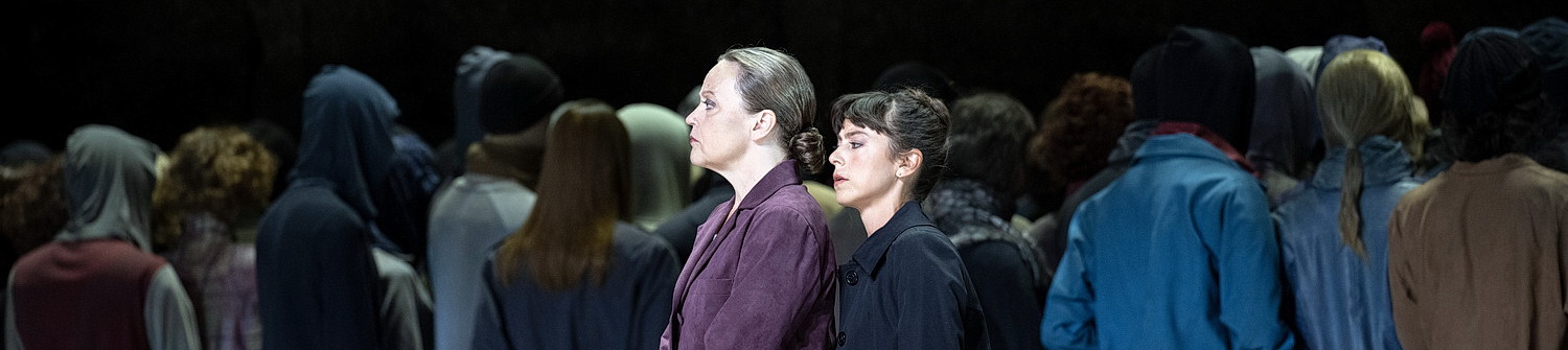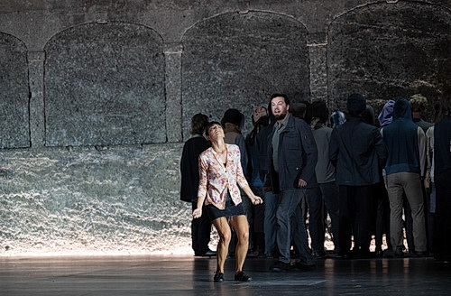 Leergeräumt ist die riesige Bühne der Felsenreitschule, auch die Arkaden sind zugemauert. Eine große, anonyme Menge von Schaufensterpuppen stehen billig bekleidet mit dem Rücken zum Publikum. Deren Formationen wird sich in den einzelnen Akten immer wieder verändert haben, wenn der Vorhang sich wieder öffnet. Es ist offensichtlich das anonyme Volk, das am Geschehen und der Familientragödie nicht teilhaben will und lieber wegschaut: Ganz auf Kulissen verzichtet Regisseur Barrie Kosky bei seiner Inszenierung von Leoš Janáčeks Káta Kabanová bei den Salzburger Festspielen. Als Bühnenbildner ist Rufus Didwiszus angeführt. Aus dieser Menschenmasse lösen sich dann immer wieder die Protagonisten heraus und agieren. Koskys Personenführung zielt genau auf den Charakter und die Psychologie der Protagonisten hin und ist ungemein detailreich und lebendig. Diese pendeln zwischen Sehnsucht und Hoffnungslosigkeit, es ist ihnen unmöglich, der völlig erstarrten Tradition und dem Psychoterror der Alten zu entfliehen. Da wird Elend und Doppelmoral zum tauglichen Lebensprinzip. Es gelingt ihm, die Tragik und Tragweite der Geschichte greifbar zu machen. Die Titelheldin rennt wie ein Kind und kindlich bekleidet, wie eine gehetzte Seele gleich zu Beginn hektisch zwischen den Menschen herum und will sich bald in den Orchestergraben, in die Wolga stürzen. Eine Vorahnung für den Schluss, denn zum Finale macht sie das auch, indem sie eine Luke inmitten der Bühne öffnet und hineinspringt.