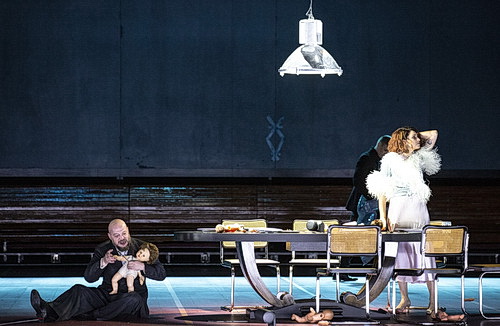 Auf der riesigen Bühne des Großen Festspielhauses wird mit Simultanszenen und filmischen Videoprojektionen, wo etwa auch der Mord an König Duncan gezeigt wird, gearbeitet. Die Hexen sind blind, bestehen überwiegend aus kleinen Mädchen und werden immer mit einem Kubus herein- oder hinausgeschoben. Das gehört zu den immer wiederkehrenden Stilmitteln des Regisseurs. Er zeigt auch ständig eigene Zitate aus seinen anderen Werken und greift immer wieder in seine Psychokiste, wofür seine Frau Malgorzata Szcześniak einen durchaus ästhetischen Psychoraum, der wie auch die Kostüme an die 1930-er Jahre erinnern, entworfen hat. Etwa werden auf einer langen, ebenfalls hereingeschobenen Tribüne für den Chor beim Festmahl später kleine Kinder, es sind jene von Macduff, vergiftet, denn Kinder von anderen erscheinen Macbeth eine Bedrohung. Gleichzeitig sieht man per Video den Herodes-Feldzug gegen die Erstgeborenen aus Pasolinis Matthäus-Evangelium. Ein anderes Mal werden Baby-Puppen auf Blumenkohl angerichtet. Als Macbeth glaubt, den ermordeten Banco zu sehen, tragen Kinder entsprechende Masken. Zum Finale sind jedenfalls Macbeth jetzt schon im Rollstuhl und seine Lady blutüberströmt gefesselt und werden von Macduff nicht erschossen, obwohl er mehrmals die Pistole auf sie richtet, sondern dem Volk zur Lynchjustiz übergeben. Trotzdem wirkt manches auf der Riesenbühne doch etwas verloren.