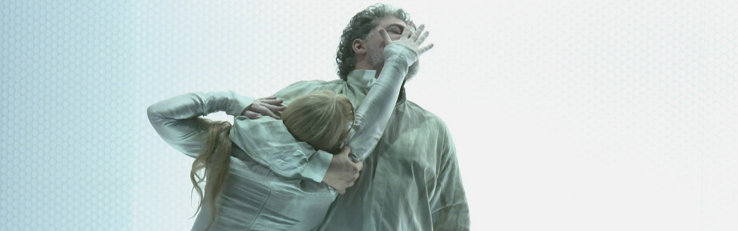 Nach dem großar­tigen Erfolg der Koope­ration der Sächsi­schen Staatsoper Dresden mit den Salzburger Oster­fest­spielen 2015 mit Caval­leria Rusticana und I Pagliacci war die Erwar­tungs­haltung für das Folgejahr 2016 natürlich hoch, zumal mit Verdis Spätwerk Otello ein spekta­ku­läres Bühnenwerk auf dem Spielplan stand. Doch die Produktion stand unter keinem guten Stern. Der für die Haupt­partie engagierte Johan Botha musste kurz vor der Premiere krank­heits­be­dingt absagen. Insider wissen, dass Botha sechs Monate später einem Krebs­leiden erlag. Der schwarze Engel, der in dieser Insze­nierung auf der Bühne wie Otellos Alter Ego omnipräsent ist, wirkt hier wie ein Todes­engel in der Zukunft. Und José Cura, kurzfristig für Botha einge­sprungen, wirkt fast wie gelähmt ob dieser Bürde. Neben großen Sänger­namen, die ja oft als Zugpferde für ein elitäres Publikum herhalten müssen, war es diesmal der Modeschöpfer Christian Lacroix, der schon häufiger mit dem Regisseur Vincent Boussard zusam­men­ge­ar­beitet hat. Dabei hält sich Lacroix bei der Kostü­mierung der Haupt­ak­teure diesmal mehr zurück und setzt auf schlichtes Outfit, dafür erscheint der Chor in farben­präch­tigen und opulenten Gewändern, quasi als farblicher Kontra­punkt zu dem eher tristen und grauen Geschehen. Lediglich Dorothea Röschmann als weißge­kleidete Desdemona wirkt von Anfang an wie ein Unschulds­engel, auch hier der Kontrast zum schwarzen Boten der Finsternis.