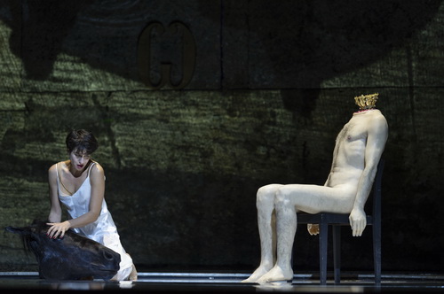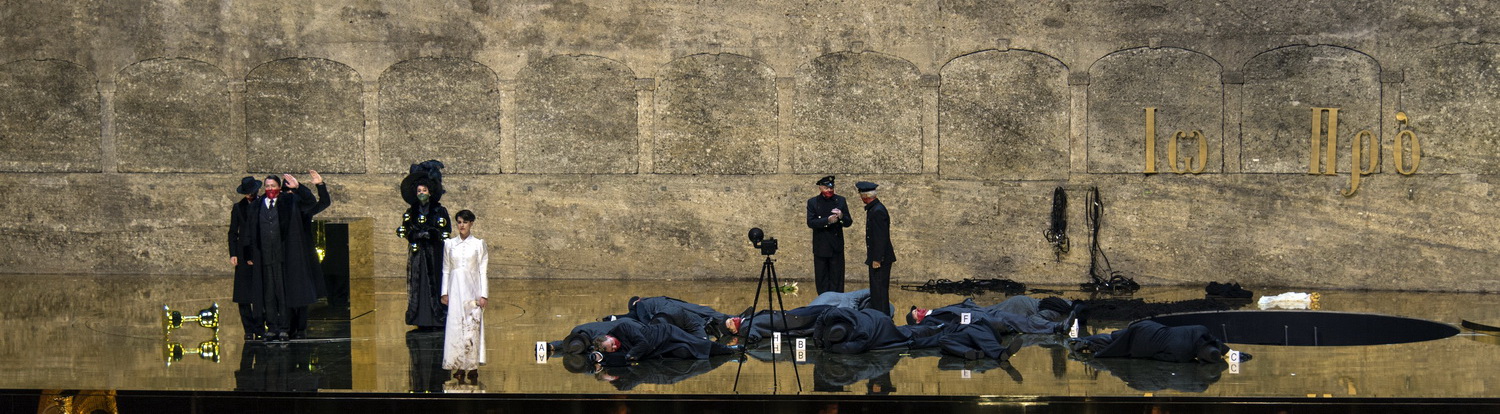 Te saxa loquuntur – Von dir sprechen die Steine, jene Inschrift über dem Salzburger Siegmundstor neben dem Festspielhaus, prangt schon zu Beginn auf dem Vorhang. Und mit Steinen hat Romeo Castellucci, Regisseur, Ausstatter, Konzeptkünstler und Symbol- und Metapher-Erfinder, die Arkaden der Felsenreitschule völlig zugebaut. Dadurch wirkt der Raum archaisch, bedrohlich einengend wie ein Gefängnis, ein Erstickungsraum, ein brutaler Steinkerker voller Konflikte. Auf einem goldenen Stein mit der Aufschrift Saxa wird die knieende, mit einem Band gefesselte, nackte Salome von einem sich von oben langsam senkenden Stein anstelle des Schleiertanzes zermalmt beziehungsweise verschwindet darin. Johanaan erscheint im Auge eines schwarzen, immer größer werdenden Mondes. Am Hofe geht es blutrünstig zu, immer wieder werden blutverschmierte Leichen in Plastiksäcken hereingeschleppt. Alle anderen Protagonisten wie auch Herodes tragen dunkle Anzüge und haben Hüte auf, die untere Hälfte aller Gesichter ist blutig. In Johanaans Zisterne hält sich auch ein Rappen auf, dessen abgeschnittener Kopf wird Salome später zu ihren Füßen gelegt. Salome badet in Milch. Der Kopf des Propheten wird ihr vorenthalten, am Ende bekommt Salome gleich seinen ganzen abgetrennten Torso serviert, auf den sie dann etwas hilflos die Krone oder den Pferdekopf aufsetzt. Zum Finale ertränkt sich die Prinzessin im Wasser. Castellucci besticht bei seiner ersten Salzburger Arbeit mit einer Serie von minimalistischen, aber eindrucksvollen Bildern und einem ungemein starken Symbolismus.