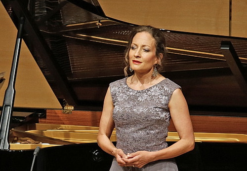 Und so wie sich dieser rote Faden durch das Programm zieht, so entfaltet sich Kargs heller, doch warmer Sopran wie ein silbernes Fädchen, an dem entlang sich die Töne spinnen. War sie in den früheren Jahren manchmal in der Höhe noch etwas scharf gewesen, so hat sich das nach der Geburt ihres zweiten Kindes schon längst gegeben. Sanft und rund ist die Stimme, die sie mit lebhafter Mimik erstrahlen lässt, sehr kopfig und obertonreich. Bewundernswert ist ihr Piano, von dem sich so manch eine Kollegin, die vielleicht eine größere Stimme hat, etwas abschauen könnte. Mit großer Ruhe geht sie ihre Lieder an, sehr innig und wohlüberlegt. Es ist eine glaubhafte Vorstellung von der Welt, die sie vorträgt. Man nimmt ihr ab, dass sie das gut nachempfinden kann, ganz besonders bei dem Frauenliebe-Zyklus von Schumann, als sie das junge, fragile Mädchen mit ihrem strahlenden, jugendlichen Timbre verkörpert. Sie beginnt ihn sehr zurückgenommen, spricht bei Helft mir, ihr Schwestern die Damen im Publikum an, zeigt und zaubert mit ihren feinen Tönen das „Bildnis“ des geliebten Mannes in den Saal. Erschütternd ist die interpretatorische Umsetzung des „Todesschlafes“ des Geliebten.