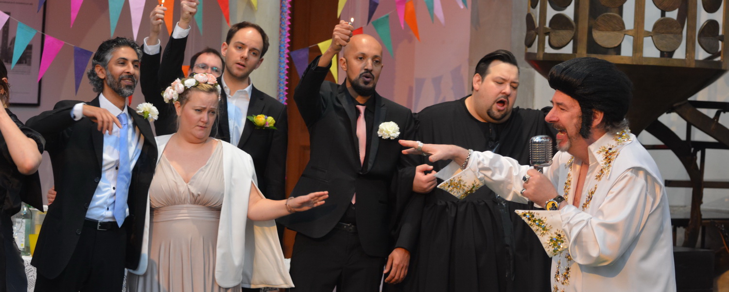 Schau­spieler, Darsteller und Sänger bekommen eine Menge zu tun, um den weiteren Ablauf in den Griff zu bekommen. Schvarz­stein selbst sorgt als Meßner in beängs­tigend-komödi­an­ti­scher Weise immer wieder für Ordnung, versucht, weitere schlimme Entwick­lungen vergeblich zu vermeiden. Unglaublich der Todes­marsch von Emma Kirkby. Die fragile Person mit der zarten Stimme verkörpert die Original-Oper ebenso wie Bethany Seymour als Braut. Beide entzücken mit ihren feinen Stimmen. Christos Pelekanos beein­druckt als Pastor nicht nur mit seiner körper­lichen Erscheinung, sondern vor allem damit, wie er trotz einer schweren Erkältung seinen Bariton angenehm und rollen­ge­recht erklingen lässt. Bassem Hawar spielt nicht nur einen Bräutigam, sondern auch die Djose. Ihm zur Seite steht der Trauzeuge Saad Mahmood Jawad mit seiner Oud. Die Tenöre Lothar Blum als Küster und Mario Lerchen­berger als Bestatter bringen ebenso beein­dru­ckende Leistungen wie Sopra­nistin Maria Jonas als Hochzeits­pla­nerin und Sängerin – unter anderem des sefar­di­schen Liedes Con la cuba y la furcha, das ursprünglich aus Istanbul stammt und auch heute noch oft auf Türkisch gesungen wird – oder die Braut­jungfern Feeda Soubaiti-el-ali und Rita William, die dann auch die drei traurigen Lieder Marabu amsi aus dem Libanon, Nanni Nanni als sephar­di­sches Lied oder das irakische Dillilol anstimmen. In diesem Stück vermi­schen sich die Kulturen ohne Hemmung und zeigen, was am Ende einer solchen Kombi­nation heraus­kommt: Bereicherung.