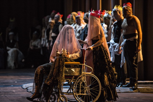 Nein, diese Oper ist kein Spaß. Das Drama fordert den Zuschauer von Anfang bis Ende. Honoré nötigt dem musealen Stoff permanent neue Sichtweisen ab, die aus dem Spiel um Machterhalt und Machtgewinn mehr als eine Begebenheit im 17. Jahrhundert machen. Dabei sind die Männerrollen durchgängig stupende besetzt. Allen voran der Marquis de Posa Stéphane Degout, der mit seinem Stimmmaterial schnell das ohnehin applausfreudige Publikum begeistert. Michele Pertusi spielt einen würdevollen spanischen König und lässt seinen Bass immer geschmeidiger werden. Wunderbar auch der schwarze Bass des Großinquisitors Roberto Scandiuzzi. Und der spanische Infant, Don Carlos, wird von Sergey Romanovsky nicht nur schön gesungen, sondern auch überzeugend gespielt. Bei den Damen begeistert vor allem Eve-Maud Hubeaux, die eine Prinzessin Eboli im Rollstuhl spielt, ihre seelischen Verletzungen also hier nach außen trägt. Stimmlich wie darstellerisch liefert Hubeaux eine erstklassige Leistung ab, die in jeder Sekunde überzeugt. Mit der eher kleinen Rolle des Pagen von Elisabeth ist Jeanne Mendoche aus dem Opernstudio goldrichtig besetzt. Ihre jugendlich-frische Ausstrahlung vermag sogar ein wenig Glanz in das sonst so trübe Licht bringen. Eigentlich ist die Elisabeth von Valois eine dankbare Rolle, mit der eine Sängerin ordentlich Lorbeeren sammeln kann. Sally Matthews gelingt das nicht. Ihre Stimme klingt, um es freundlich auszudrücken, matt – zum Ende hin scheint auch die Kondition zu fehlen. Der Chor macht diesen kleinen Einbruch mehr als wett. Auch wenn die Namen der Chorleiter wechseln, den Don Carlos hat Denis Comtet einstudiert, die Choristen bleiben die gleichen. Und gemeinsam mit Daniele Rustioni werden sie auch die folgende Aufführung gestalten. Eine Mammutleistung, die in jeder Hinsicht aller Ehren wert ist.