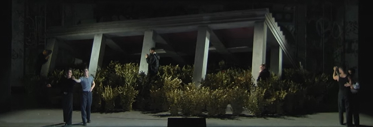 Auf neudeutsch ist das irgendein Beton­bunker in einem sozialen Brenn­punkt. Die Szenerie ändert sich nach dem Inter­mezzo, wenn die Treppe sich dreht und ein hinfäl­liges Hinter­trep­pen­sze­nario, das grün bepflanzt ist, zum Vorschein kommt. Männer tanzen zu den Klängen des Inter­mezzos, was die streng konser­vative und katho­lische Ausrichtung der Handlung der Oper natürlich konter­ka­riert, zumal auch in dieser Szene keine Gefühle zugelassen werden. Alles ist irgendwie kalt, verfallen, leblos, und der Großteil der „Handlung“ spielt sich im Sitzen auf diesem Treppen­aufbau ab. Norma­ler­weise braucht die Caval­leria Rusticana gar kein großes Bühnenbild oder eine Insze­nierung. Mascagnis gewaltige Musik­sprache reicht da vollkommen aus. Doch die Umstände einer Corona-Insze­nierung machen auch vor der musika­li­schen Umsetzung nicht halt.