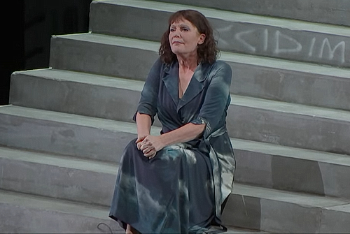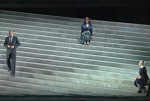 Genau diese Gefühle fehlen in Freys Insze­nierung. Gemeinsam mit dem Bühnen­bildner Martin Zehet­gruber schafft sie eine kalte, distan­zierte Atmosphäre, die keinerlei heißblütige italie­nische Leiden­schaft zulässt. Hinzu kommen Abstands­re­ge­lungen auf der Bühne, die aus einer graffi­ti­be­schmierten Beton­treppe besteht, an der der Zahn der Zeit genagt hat. Etwas grüner Farn rechts und links der Treppe lässt ein wenig Natur durch­scheinen. Oberhalb der Treppe ein starrer Gerüstbau, wo die eine oder andere Person auf- und abgeht. Die Kostüme von Bettina Walter sind zeitlos modern, vielleicht eine Spur zu elegant für das kalte Setting.