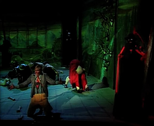 Der Chor der Württembergischen Staatsoper Stuttgart ist mit viel Spielwitz und Engagement bei der Sache und von Ulrich Eistert bestens eingestimmt. Auch das Orchester der Staatsoper unter der Leitung des damals noch sehr jungen GMD Dennis Russel Davies weiß zu überzeugen. Schon die ersten Töne der Ouvertüre, langgezogen und düster, lassen das Unheil ahnen, das da kommen wird. Die einzelnen Motive werden dominant herausgearbeitet, und das Tempo erscheint langsam, dafür intensiv und atemraubend. Davies wühlt in den dunklen Tiefen der Partitur und betont das Dämonische in der Musik. Dabei ist sein Schlag präzise, sein Dirigat sängerfreundlich und unprätentiös. Das Publikum dieses Mitschnitts, das schon während der Aufführung nicht mit Szenenapplaus geizte, bricht am Schluss fast schon in Jubel aus. Von Ablehnung oder gar Skandal ist da nichts mehr zu merken. Dafür gibt es auch keinen Grund, denn Achim Freyer hat mit dieser Inszenierung zwar ein vordergründig biederes, aber unter der Oberfläche ein tiefenpsychologisch verästeltes Werk auf die Bühne gebracht, das man auch nach vierzig Jahren gut anschauen kann, ja sogar tauglich für den Musikunterricht in der Schule, wenn man dem interessierten Nachwuchs eine wunderbare deutsche Oper näher bringen möchte. Schade nur, dass die Bildqualität so schlecht ist und die Kameraführung so statisch.