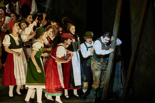 Das beginnt schon beim Bühnenbild, ein architektonisches, detailverliebtes Meisterwerk. Eine Mischung aus Zimmer und romantischer Landschaft, liebevoll ausgemalt – das sieht man heutzutage nur noch ganz selten. Bis an die Seitenlogen zieht sich die Kulisse. Die Fluchtpunktperspektive sorgt dafür, dass der Zuschauer in die Bühne eintauchen kann, ja fast hineingesaugt wird. Zusammen mit den Kostümen steht auf dem ersten Blick das klassische Volkstheater im Mittelpunkt. Da gibt es Trachten und Lederhosen zu sehen, die Jagdgesellschaft tritt im satten Förster-grün auf. Mit dem Eremiten, mit weißem Rauschebart, wird die Oper eröffnet. Vor der Ouvertüre wird das zentrale Motiv, der Kampf Gut gegen Böse, Gott gegen den Teufel, benannt. Ein Motiv, das sich auch im Bühnenbild wiederfindet: das allsehende Auge Gottes in der Bühnenmitte, darüber der schwarze Stein der Wolfsschlucht mit seinen geisterhaften Formen. Der Eremit möchte Agathe und Max genau vor diesen dunklen Mächten beschützen, und so gibt er Agathe gesegnete weiße Rosen mit, die später in der Handlung noch ihre Bedeutung finden werden.
