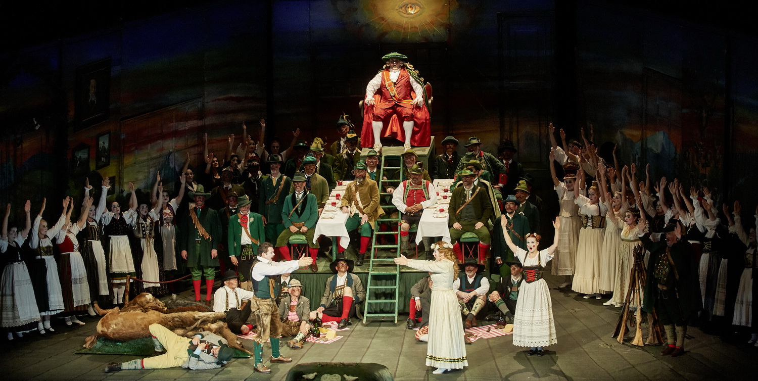 Das beginnt schon beim Bühnenbild, ein architektonisches, detailverliebtes Meisterwerk. Eine Mischung aus Zimmer und romantischer Landschaft, liebevoll ausgemalt – das sieht man heutzutage nur noch ganz selten. Bis an die Seitenlogen zieht sich die Kulisse. Die Fluchtpunktperspektive sorgt dafür, dass der Zuschauer in die Bühne eintauchen kann, ja fast hineingesaugt wird. Zusammen mit den Kostümen steht auf dem ersten Blick das klassische Volkstheater im Mittelpunkt. Da gibt es Trachten und Lederhosen zu sehen, die Jagdgesellschaft tritt im satten Förster-grün auf. Mit dem Eremiten, mit weißem Rauschebart, wird die Oper eröffnet. Vor der Ouvertüre wird das zentrale Motiv, der Kampf Gut gegen Böse, Gott gegen den Teufel, benannt. Ein Motiv, das sich auch im Bühnenbild wiederfindet: das allsehende Auge Gottes in der Bühnenmitte, darüber der schwarze Stein der Wolfsschlucht mit seinen geisterhaften Formen. Der Eremit möchte Agathe und Max genau vor diesen dunklen Mächten beschützen, und so gibt er Agathe gesegnete weiße Rosen mit, die später in der Handlung noch ihre Bedeutung finden werden.