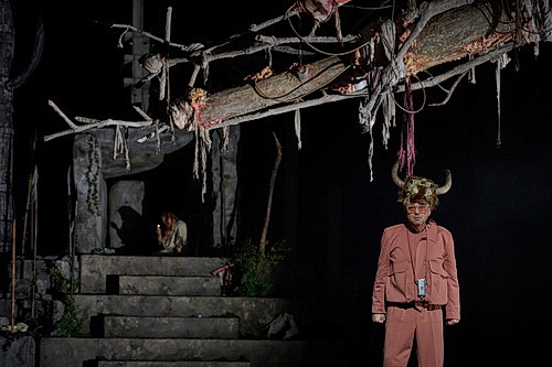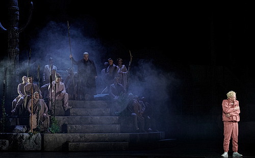 Die Szene auf dem Walkürenfelsen wirkt auch wie aus einer längst ausgestorbenen Zeit. Eine Art Höhle, aus der Siegfried mit einem halbärmeligen Vogelkleid und einem Helmflügel erscheint, darunter ein durchsichtiges Netzhemd, was sehr körperbetont ist und den armen Daniel Kirch in dieser Rolle nicht gerade vorteilhaft kleidet. Sein Schwert Nothung ist ihm lediglich auf den Leib tätowiert. Ein Totempfahl, wieder eine Anspielung auf Karl May, Totenschädel von Mensch und Tier und viel Bühnennebel sind die Ausstattung des Bühnenfelsens. Brünnhilde ist wie eine Hohepriesterin gekleidet, mehr Norma als Walküre. Und Siegfried wirkt schon dümmlich, bevor er Hagens Droge konsumiert hat. Das ist kein hehres Paar da auf dem Walkürenfelsen, denn Siegfried kann Brünnhildes Dimension nicht erfassen. Und so will er nach einer Liebesnacht auf dem Felsen weg zu neuen Taten. Der Walkürenfelsen ist nur für einen Moment Stätte des Glückes von Brünnhilde und Siegfried.