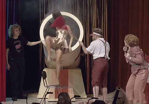 Vom Unter­hal­tungswert ist die Aufführung allemal auch für Kinder geeignet. Die Regis­seurin hat hier eine bunte, flotte und vor allem filmisch schlüssige Insze­nierung geschaffen, die einein­viertel Stunden wie im Fluge vergehen lässt. Elisabeth Vogetseder gestaltet den gesamten Raum zur Bühne. Eine Guckkas­ten­bühne ist mit zahlreichen Vorhängen ausge­stattet, in die zwischen­zeitlich eine Tür eingebaut wird und die den Blick auf Maske und Garderobe freigibt. Zeitgleich haben die Kameras das vor der Bühne aufge­baute Orchester und das Pult des Schau­spiel­di­rektors im Blick. Die Kamera­führung wirkt absolut profes­sionell, immer noch keine Selbst­ver­ständ­lichkeit bei Online-Produk­tionen von Theatern. Die Licht­ge­staltung ist ebenso wie die Tontechnik fast durch­gängig gelungen. Es gibt ein, zwei Aussetzer, die man wirklich vernach­läs­sigen kann. Zumal Vogetseder herrliche Fanta­sie­kostüme entworfen hat, die einen rechten Augen­schmaus darstellen.