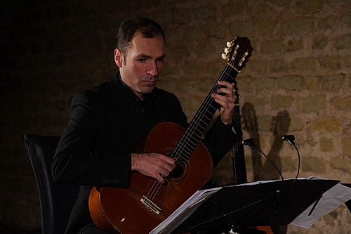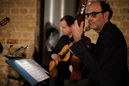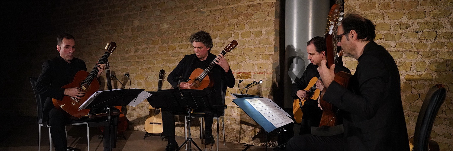 Zunächst einmal ist hier nichts neu. Nach der etwas spröden Anmoderation treten vier Herren in schwarz auf, setzen sich in langgeübter Praxis im Halbkreis vor das Publikum und beginnen nach einigen Stimmarbeiten das Konzert mit Un mar de tierra blanca von Mauricio Sotelo aus dem Jahr 2017. In der Umgebung der Thermenüberreste entfaltet sich ein wunderbares Klangbild, zunächst kaum hörbar, später immer präsenter. Ohne weitere Erläuterungen geht es in das Jahr 2019, aus dem polvo, tumba von Nùria Giménez Comas stammt. Ist es schon ein Genuss, einem Gitarrenvirtuosen zu lauschen, wird es schnell zum Staunen, wenn man die Zusammenarbeit der vier Musiker erlebt. Hier geht es um Millisekunden, feinste Nuancen in Lautstärke und Anschlag, soll aus dem Gitarrenstück ein Erlebnis werden. Dem Adelph-Gitarrenquartett gelingt das mit höchster Konzentration. So auch, wenn es mal eben ganz unauffällig in das 16. Jahrhundert zurückgeht. In dieser Zeit hat der italienische Benediktinermönch, Organist und Komponist Adriano Banchieri die Fantasie overo canzoni alla francese für „vier beliebige Instrumente“ verfasst, hier also für vier Gitarren. Dass dem Publikum hier alte Musik „untergejubelt“ wird, fällt möglicherweise dem auf, der aufmerksam das Programmheft mitverfolgt, in dem die Jahresangabe fehlt. Alle anderen lassen sich weiter vom Können der Musiker begeistern, die übergangslos zum Kampftanz in das Jahr 1999 zurückkehren, den Manuel Hidalgo komponiert hat. Deutlicher wird der Unterschied zum Quartett, das Georg Friedrich Haas 2007 verfasst hat. Mit der Music for Marcel Duchamp von John Cage gibt es noch eine Zugabe aus dem Jahr 1947, die vom Publikum ebenso frenetisch beklatscht wird wie der vorangegangene Abend.