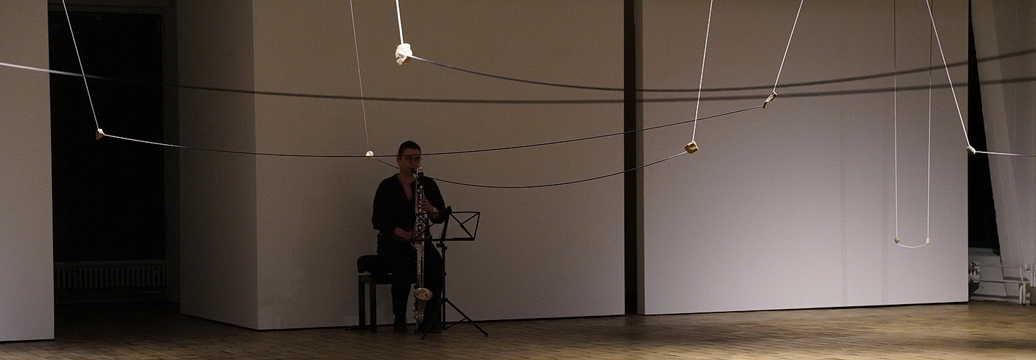 Wie Christine Fausten zeigt auch Sijstermans eine Ausstellung. Die Klarinettistin und Komponistin betätigt sich gern auch als Installationskünstlerin, um dann innerhalb ihrer raumgreifenden Installationen ihre eigenen Musikstücke aufzuführen. Während des Festivals hat sie im zweiten Obergeschoss der TUFA die Installation Kaii-ii gehängt. Ein Kaii-ii ist die Behausung der Pirahã, einem Stamm, der im Amazonasgebiet lebt und als „das glücklichste Volk der Welt“ gilt. Die Hütten werden als temporäre Gebilde begriffen. Sijstermans stellt sie mit Fäden und daran befestigten steinähnlichen Gebilden dar, die Strukturen im Raum bilden. Der gelernte Respekt der Deutschen vor der Kunst ist hoch. Obwohl nirgendwo „Berühren verboten“ steht, kommt niemand auf die Idee, die Fäden in Schwingung zu versetzen. Brav nehmen die Besucher sich Stühle aus dem Vorraum mit in den Saal und setzen sich an den Wänden entlang. Am Kopf- und Fußende ist jeweils ein Notenpult aufgestellt. Oben nimmt Sijstermans mit ihrer Bassklarinette Platz, unten sitzt bereits Marcus Kaiser mit seinem Cello. Der dritte im Bunde, der eigentlich eine zweite Komposition mitspielen sollte, Theo van der Poel mit Akkordeon, fällt wegen einer Corona-Infektion aus. Es bleibt also bei dem Stück Elexen. Es bleibt eine Abfolge von Tönen. Sijstermans gibt einen Ton vor, Kaiser zieht nach. Danach Stille. Es ist eine Mischung aus Minimal Music und Meditation. Viele der zahlreichen Besucher, die sich zu später Stunde noch einfinden, schließen die Augen. Anderen fällt es schwer, sich nach dem aufwühlenden Schweigen der Dafne auf diesen Raum der Ruhe zu konzentrieren. Sähe man die Aufführung unter dem Label „neue Musik“, wäre es wohl eine jener typischen Aufführungen, die Besucher eher verschrecken. Unter dem Begriff Klangkunst bleibt die Toleranzschwelle höher.