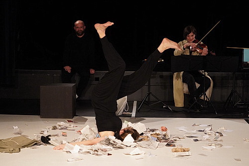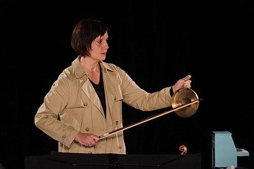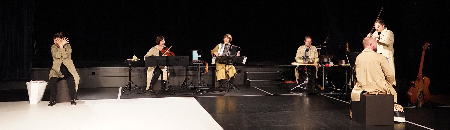 Unterlegt wird das Bühnengeschehen mit Klängen, die Christina C. Messner komponiert hat. Messner selbst übernimmt die Geige, Dorrit Bauerecker das Akkordeon, Norbert Krämer ist für das Schlagwerk zuständig und Janko Hanushevsky übernimmt den E‑Bass. Indem jeder Musiker zahlreiche zusätzliche Instrumente übernimmt und die eigenen Instrumente in ungewohnter Weise bedient, entsteht eine Klangwelt, die streckenweise auch als Filmmusik inklusive Geräuschkulisse durchgehen könnte. Allerdings kapriziert sich Messner allzu sehr darauf, den Hintergrund zu füllen. Hier hätte man sich durchaus mal den einen oder anderen deutlichen Akzent gewünscht. Und so schaden die Klänge keinem, entwickeln aber auch kaum Eigenständigkeit.