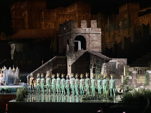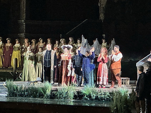 Im Prinzip hat man nun das, was man nördlich der Alpen zunehmend vermisst: Eine historisierende Aufführung, die nicht wie im Regietheater nur eine Idee des Regisseurs aufgreift und strikt verfolgt. Aber ist damit alles gewonnen? Man könnte sich nun ganz in die Illusion hineinversenken, minutiös den Abläufen folgen, sich in der historischen Stadt und dem Geschehen befindend. Es wird auch alles getan, um die Illusion zu vervollkommnen, Nixen und Wassermänner ergänzen die Natur, Mitglieder des Orchesters sitzen im ersten Akt zum Fest des Herzogs auf der Bühne, unzählige Mitglieder des Chores und der Statisterie befüllen die Fläche. Aber irgendwie will sich das Aha-Erlebnis nicht einstellen, obwohl eigentlich alles stimmt. Oder doch nicht alles?