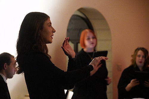 Eine Choristin übernimmt Begrüßung und Moderation, was zu der kuriosen Situation führt, dass Antwerpen jedes Mal den Raum vor dem Altar durchqueren muss, um ihr das Mikrofon hinzustellen. Es wird lebhaft bleiben. Allerdings liegt das eher daran, dass der Chor sich hat eine Menge einfallen lassen, um vor allem musikalisch für Abwechslung zu sorgen. Der Abend wird mit einem Duett von Stille Nacht eröffnet. Andrea Magiera, deren Haare über das Jahr extrem abgedunkelt sind, und Stella Antwerpen sorgen so gleich dafür, dass die richtige Stimmung aufkommt. Danach ist Schluss mit deutschen Weihnachtsliedern. Aus völlig unersichtlichem Grunde wird es ein englischer Abend. Nun gibt es glücklicherweise keine Pflicht, deutsche Weihnachtslieder zu intonieren, bloß weil man ein Weihnachtskonzert in Deutschland gibt. Allerdings ist Englisch auch nicht die zweite Amtssprache. Und es gibt eine Menge ganz wunderbarer Weihnachtslieder in allen möglichen Sprachen, die einem solchen Abend internationales Flair verleihen können, wenn man das will. Voi’Sis haben unter Andrea Magiera beschlossen, sich auf das Englische zu kaprizieren. Bitte schön. Der schön gestaltete Abendzettel bietet keinerlei Übersetzungshilfen. Also ist das Publikum auf den Klang der Lieder angewiesen. Dabei drücken sich Gabriel und Stella Antwerpen wechselweise am Dirigentenpult vorbei, um das Klavier zu bedienen.