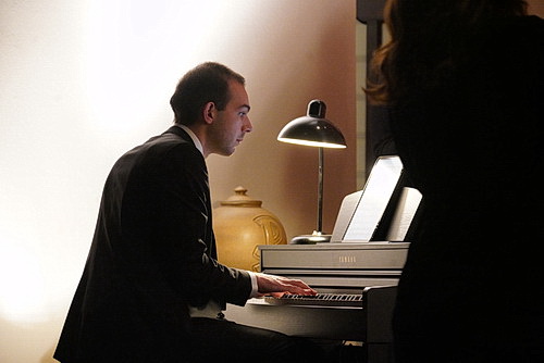 Wie im vergangenen Jahr ist auch dieses Mal vor der Kirche wieder ein Glühwein-Stand aufgebaut, an dem sich das Publikum vor der Aufführung versammelt. Zwar ist auch die Kirche in diesem Jahr wieder sehr gut besucht, aber ansonsten ist alles eine Nummer kleiner. Vor allem am Licht wird gespart. Was vielleicht für eine gemütlichere Atmosphäre sorgt, aber auch den weihnachtlichen Glanz ein wenig vermissen lässt. Ein recht kümmerlicher Weihnachtsbaum, der lediglich mit einer schmalbrüstigen Lichterkette geschmückt ist, hat seinen Platz hinter dem Chor im Altarraum Platz gefunden. Die Beleuchtung dahinter erinnert eher an die Restglut eines Kamins. Immerhin gibt es für das Klavier, das in die linke vordere Ecke gerückt ist, hellen Lichterschein.