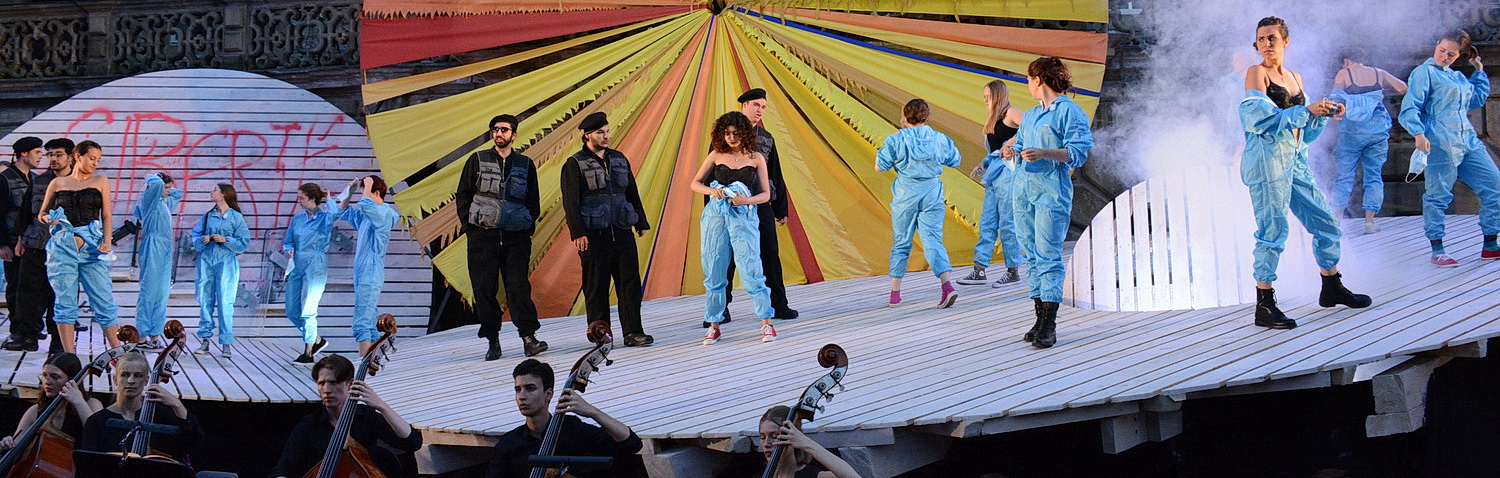 Gut, dass da die Musik über viele unklare Leerstellen hinweghilft. Schon vor der Ouvertüre sieht das Publikum eine junge Frau mit Rucksack, die „Liberté“ auf die Wand sprüht, also mit Street-Art protestiert und vor sich hin summt; ihr Schlaflied Farashat ist im Programmheft nachzulesen. Sie will „Freiheit auf allen Ebenen“. Mit der Ouvertüre aber, mit viel Schwung und spritzigem Temperament, sehr konzentriert und prägnant gespielt vom großartigen Bundesjugendorchester, entsteht sofort eine fesselnde Atmosphäre. Die ist gar nicht so leicht herzustellen, denn im weiten Schlosshof verschwimmen die Töne etwas. Aber es beeindruckt, wie Dirigent und musikalischer Leiter Elias Grandy die jungen, sehr aufmerksam mitgehenden Musiker zu einem homogenen, geschmeidigen, weichen Klang führt, zu feinen Abstufungen und oft geradezu neckischen Akzentuierungen. Als dann Soldaten einmarschieren – ein einzelner Kämpfer mit MP soll auf vorherige Kriegs-Gewalt hinweisen – um mit Schilden gegen Störer vorzugehen, sind bald auch die beiden weiblichen Hauptpersonen der Oper zu sehen und zu hören, Carmen und Micaëla, die zwei Gegenpole, die eine selbstbestimmt, widerborstig, aufbegehrend gegen alle Zwänge, die andere freundlich, angepasst, bürgerlich. Carmen scheint zuerst unter ihren Kolleginnen, die sich in der Pause aus ihren blauen Arbeits-Overalls herausschälen und mit ihren Reizen nicht geizen, relativ unauffällig, aber wenn sie ihre langen, schwarzen Haare fallen lässt und mit ihrem berühmten Preislied auf die Liebe, der Habanera, alle Aufmerksamkeit auf sich zieht, und als sie den etwas harmlos wirkenden José mit einer Blume anmacht, zeigt sie ihre wahren Ambitionen. Sie will emotional Unruhe stiften. Fiorella Hincapié, der hervorragenden Mezzosopranistin aus Kolumbien, gelingt das mit ihrer ausdrucksstarken, großen Stimme mit sinnlicher Note und tollen Steigerungen, stets präsent mit viel Elan. Sie fürchtet sich nicht vor dem Tod, von dem sie aus den Karten erfährt, als ihre Gefährtinnen, Mércédès, Magdalena Hinz, überzeugend in Spiel und Gesang, und Frasquita, Bogna Bernagiewicz, brillierend mit glänzenden Höhen, ihr die Zukunft weissagen wollen. Carmens Gegenpart um die Gunst Josés aber ist die etwas biedere Micaëla; zwar verliert sie von der Handlung her, aber Silvia Sequeira aus Portugal übertrifft alle mit ihrem wunderbar tragfähigen Sopran, kann allen Schmerz anrührend ausdrücken und begeistert mit schönen Legati, strahlenden Höhen und variablen Färbungen. José aber, eine eigentlich unsichere Person, fühlt sich hingezogen zu Carmen, zum Abenteuer. Der Koreaner Leo Jaewon Jung beginnt mit etwas gaumigem Tenor, steigert sich aber immer mehr und gewinnt in der berühmten Blumenarie überzeugend lyrische Qualitäten und feine Höhen. Sein Rivale um Carmen ist Escamillo, ihm lediglich an körperlicher Größe überlegen; Hao Wen aus China aber kann nicht unbedingt durch Strahlkraft eines heldischen Baritons in seinem bekannten Torero-Auftritt überzeugen, bei flacher Tongestaltung und etwas fehlender Tiefe. In der zum Künstler-Treff umfunktionierten Schenke versammelt sich das muntere Völkchen, transparent und abwechslungsreich gesungen vom Chor, angeführt von Dancairo. Gideon Henska, und Remendado, Marcelo Alexandre; klangschön ihr Quintett mit den drei „Zigeunerinnen“. Die Soldaten Zuniga, Christoph Schweizer, und Moralès, Johannes Worms, vervollständigen die Männerriege. Insgesamt macht die Dramatik des Gesangs die etwas schematische Bewegung auf der Bühne wieder wett. Am Schluss, als José Carmen erstochen hat, zerbirst der Sonnenkreis, nur ein kleines Mädchen erscheint mit einem roten Luftballon-Herz. Symbolische Bedeutung?