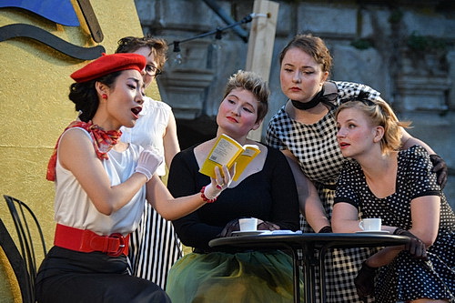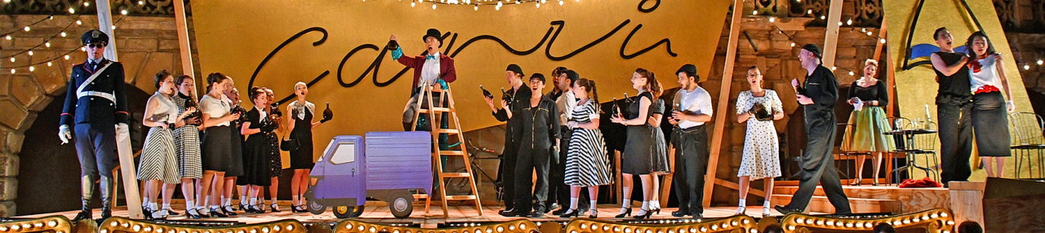 Peters-Messer verlegt die Handlung in das Italien der 1950-er Jahre, was das infor­mative Programmheft von Drama­turgin Clara M. Richter schon vorher erläutert. Eine einfache Holzbühne erinnert an Jahrmarkt­auf­füh­rungen, die schrägen Holzpfeiler, die die Konstruktion stützen, Lichter­ketten und der Schriftzug Capri an einen Zirkus. Der etwas erhöhte rechte Teil der Bühne ist einem kleinen Café vorbe­halten, den eine Frauen­figur im Stil der 50-er Jahre dominiert. Adina insze­niert sich hier als gebildete Lady, die anfangs auf den Burschen vom Land, Nemorino, herab­schaut. Belcore tritt als Carabi­niere in Uniform auf, Dulcamara knattert als Zirkus­dompteur oder Magier in einer knall­blauen Piaggio Ape auf die Bühne. Den gleich erschei­nenden Inter­es­sierten verkauft er seine Zauber­tränke in kleinen Bocks­beuteln, man ist schließlich in Badisch-Franken. Die wunderbar die Insze­nierung unter­strei­chenden Kostüme von Schuett zeigen sich zunächst in schwarz-weiß, später, als auch Nemorino sich in einen Clown umschminkt und Adina als Columbine erscheint, mimen auch die Chormit­glieder mit bunten Halskrausen Figuren der Commedia dell‘ arte. Am Ende ist alles gut, und die beiden Liebenden finden sich bei Monden­schein und Sternen­himmel. Den konnten bisher zwei Auffüh­rungen bieten, die anderen mussten wegen schlechten Wetters halbsze­nisch in der Tauber­phil­har­monie stattfinden.