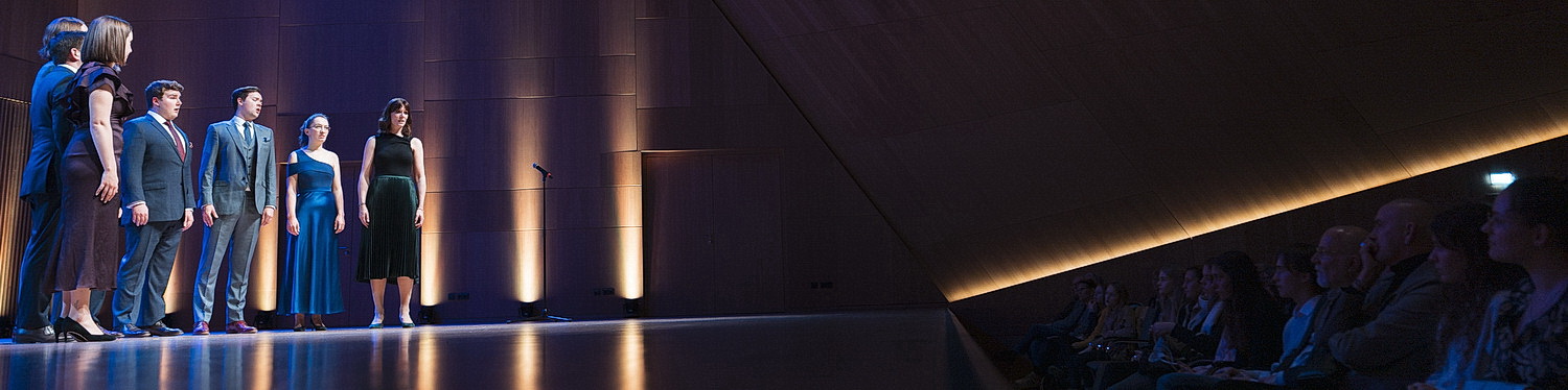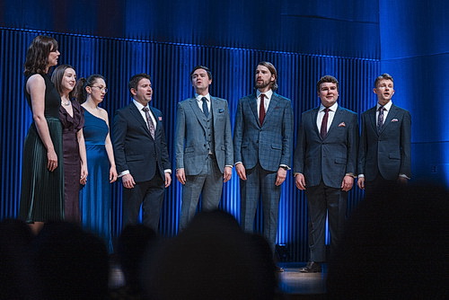 Zum Konzert haben sie noch Zeit gefunden, sich in Schale zu werfen, im feinen Abendkleid und Anzug kommen sie auf die Bühne. Aber das ist völlig egal, sie singen ebenso wie vorher lupenrein, aufeinander hörend, jede Stimme erkennbar machend, durchsichtig. Nach so viel Wohlklang tut einem der Applaus in den Ohren weh. Brittens sechs Choral Dances zeigen verschiedene Seiten des Ensembles, mal nachdenklich, mal humorvoll ausgelassen. Die Acht singen auswendig und unterstreichen ihren Gesang nur durch sehr feine, manchmal kaum merkliche Gesten. Verlassen aber auch schon mal ihren Platz, um wechselnde Paare zu bilden. Altus Smith ist der Spiritus Rector der Gruppe und moderiert auch hier neben anderen, im Sopran singt neben Noon Andrea Haines. Altistin Katie Jeffries-Harris bringt samtige Tiefe, zu der sich die Tenöre Blake Morgan und Euan Williams, Bariton Christopher Moore und Bass und Beatboxer Dominic Carver gesellen.