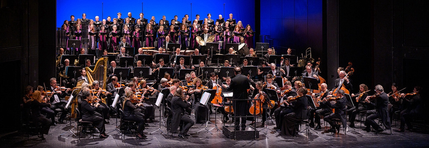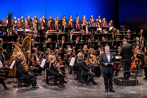 Man kann sich generell fragen, warum bei einer Chorgala, bei der ein Chor im Mittelpunkt des Geschehens stehen sollte, die Sänger im Hintergrund platziert werden und das Orchester direkt davor. Der Chor gewänne sehr an Präsenz, wenn man ihn weiter vorne am Rand der Bühne platzierte und das Orchester entweder dahinter oder im Graben. Einer besseren Textverständlichkeit käme das wohl auch zugute, auch der Kontakt zum Publikum wäre besser.