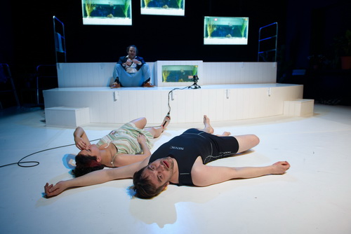 Und das ist auch einer der wesentlichen Erfolgsfaktoren bei Nullzeit. Kaum hat das Spiel begonnen, ist dem Publikum egal, ob 2012 Juli Zeh einen Roman geschrieben hat. Denn Regisseur Brian Bell sorgt dafür, dass gleich alle Sinne der Zuschauer beansprucht werden, wenn Sven Fliedner sein Jura-Examen unter absurden Bedingungen zum Abschluss bringt. Bahadir Hamdemir hat dazu eine Video- respektive Projektionstechnik eingesetzt, die nicht nur für fantastische Bilder, sondern auch für eine klare Struktur sorgt. Natürlich in enger Zusammenarbeit mit Lichtbildner Marcus Schale. Auf der Bühne lässt Teresa Rinn ihre Fantasie sprießen. Im Mittelpunkt gibt es ein zweistufiges Podium, in dessen Mitte ein Aquarium Platz findet. Dahinter drei Monitore für Einspielungen oder auch Live-Übertragungen. Links und rechts schöne Accessoires wie tropische Blumen, ein paar Sitzgelegenheiten, die Atmosphäre einer tropischen Insel eben. Die Kostüme, ebenfalls von Rinn gestaltet, sind arg typisierend, bei der weiblichen Hauptdarstellerin wird das Kostüm so „erotisch“ gewählt, dass die ständig mit der Korrektur des Dekolletés beschäftigt ist. Das trübt ein wenig den sonst immer wieder aufkommenden Spaß.