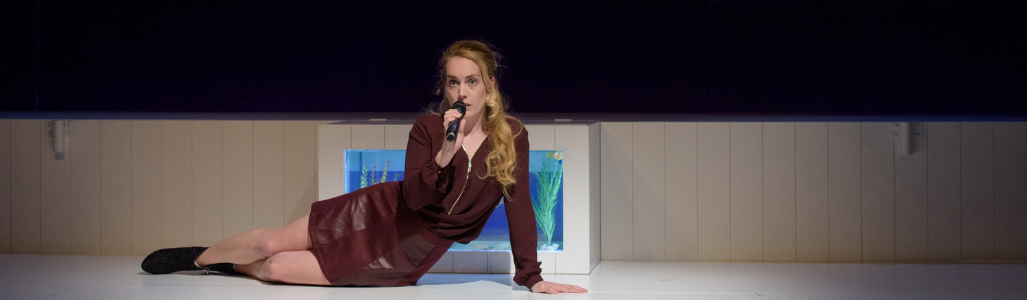 Und das ist auch einer der wesentlichen Erfolgsfaktoren bei Nullzeit. Kaum hat das Spiel begonnen, ist dem Publikum egal, ob 2012 Juli Zeh einen Roman geschrieben hat. Denn Regisseur Brian Bell sorgt dafür, dass gleich alle Sinne der Zuschauer beansprucht werden, wenn Sven Fliedner sein Jura-Examen unter absurden Bedingungen zum Abschluss bringt. Bahadir Hamdemir hat dazu eine Video- respektive Projektionstechnik eingesetzt, die nicht nur für fantastische Bilder, sondern auch für eine klare Struktur sorgt. Natürlich in enger Zusammenarbeit mit Lichtbildner Marcus Schale. Auf der Bühne lässt Teresa Rinn ihre Fantasie sprießen. Im Mittelpunkt gibt es ein zweistufiges Podium, in dessen Mitte ein Aquarium Platz findet. Dahinter drei Monitore für Einspielungen oder auch Live-Übertragungen. Links und rechts schöne Accessoires wie tropische Blumen, ein paar Sitzgelegenheiten, die Atmosphäre einer tropischen Insel eben. Die Kostüme, ebenfalls von Rinn gestaltet, sind arg typisierend, bei der weiblichen Hauptdarstellerin wird das Kostüm so „erotisch“ gewählt, dass die ständig mit der Korrektur des Dekolletés beschäftigt ist. Das trübt ein wenig den sonst immer wieder aufkommenden Spaß.