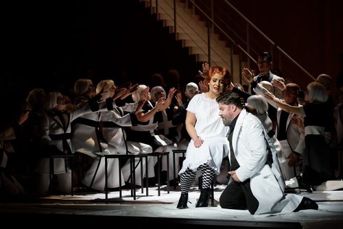 Auf der Eintrittskarte zur Premiere ist das Zitat von Hermann, Landgraf von Thüringen, aus dem zweiten Aufzug vermerkt: „Die holde Kunst, sie werde jetzt zur Tat!“ Die Aufforderung von Hermann an die Minnesänger erscheint wie eine programmatische Ankündigung des Regisseurs, Wagners Kunst in neue Taten umzusetzen. Und es wird tatsächlich ein Abend der kontroversen Gegensätze. Der junge Regisseur Maximilian von Mayenburg hat da ganz spezielle Ansichten zu den Beziehungsgeflechten Tannhäuser – Venus – Elisabeth – Wolfram. Für ihn beschreibt das Werk eine „Pilgerreise des Menschseins“. So hat für ihn der Beginn der Oper, insbesondere die Bacchanal-Szene, etwas von einer Urgeburt. Er beschreibt „das Einssein mit der Natur wie das Kind im Mutterleib“. Und so ähnelt der Venusberg einem überdimensionalen Uterus, in dem aus vierzehn Eizellen im Rhythmus der Wagnerschen Musik ekstatisch Menschen sich gebären und dann unter einen riesigen Rock der Venus kriechen. Venus ist hier mehr als die Göttin der Liebe, sie ist eine Göttin der Fruchtbarkeit, thematisch nahe zur Urmutter Erda in Wagners Ring. Dass Tannhäuser in dieser Umgebung als Mann überfordert ist, liegt nahe, es drängt ihn hinaus aus dieser Gebärhöhle. Den zweiten Aufzug beschreibt von Mayenburg als „Konflikt der Adoleszenz, dem Entdecken der Liebe und der sexuellen Begierde. Und er wendet sich ab vom klassischen Rollenverständnis der Frau im Tannhäuser. Venus als Hure, Elisabeth als Heilige, das ist dem Regisseur zu absurd. Die „Ambivalenz des menschlichen Wesens zwischen Natur und Geist“, zwischen Spiritualität und Triebhaftigkeit, das mache das Wesen der menschlichen Natur aus. Und so stellt von Mayenburg die Gesellschaft im zweiten Aufzug als von Tannhäusers Gesang hochgradig sexuell erregt dar, bis hin zu einer angedeuteten Orgie. Doch hier schießt der Regisseur das erste Mal deutlich übers Ziel hinaus und am Werk vorbei. Wenn die anderen Minnesänger sich ihren Trieben hingeben, und mehr mit sich selbst als mit Tannhäusers provokanten Äußerungen beschäftigt sind und auf Hermanns mahnende Worte: „Zurück vom Schwert – Ihr Sänger haltet Frieden“ nicht reagieren, dann passt das einfach nicht. Und die Gesellschaft, eine postmoderne Clique ohne freien Willen, alle uniform in futuristische Anzüge gekleidet, mit weißblonden Perücken und Sonnenbrillen: Das Bild steht in keinerlei Kontext zu den vom Regisseur eingangs erwähnten Überlegungen. Dass während des Sängerwettstreits die Minnesänger mehr als skurrile Typen auftreten, die diese Szene zu einer Persiflage gestalten, sei nur am Rande erwähnt. Heinrich der Schreiber macht seinem Namen alle Ehre und notiert fortwährend etwas in sein schwarzes Notizbuch.