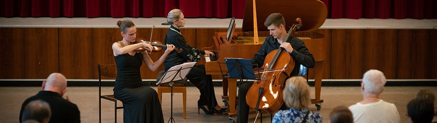 Der nächste Mann des Abends ist Held der Ukraine und Volkskünstler der Ukraine. Myroslav Skoryk wurde 1938 in Lwiw geboren und starb vor drei Jahren in Kiew. Er studierte in Lwiw und Moskau, arbeitete als Komponist und Musiklehrer. Seine Karpatische Rhapsodie für Violine und Klavier hat das Zeug zum Ohrwurm. Davon konnten sich bereits die Besucher am Freitag überzeugen, als das Stück bereits als Zugabe zu hören war. Schon da überzeugte Gordeyeva, aber heute breitet sie ihre Schwingen aus und spielt noch einmal befreiter auf. Mit A‑RI‑A für Cello und Klavier hebt Skoryk Genre-Grenzen auf, und Rymar weiß das perfekt umzusetzen. Wie später zu erfahren sein wird, wird die Elegie, die als nächstes auf dem Programm steht, „aus Zeitgründen“ gestrichen. Die Zeit allerdings hätte sich das Publikum gern noch genommen. Stattdessen wird das dreisätzige Trio für Violine, Cello und Klavier zur Aufführung gebracht. „Drei Sätze, die man nicht zu ernst nehmen sollte“, unterstreicht Petrychenko den Unterhaltungscharakter des Stücks. Gebannt lauscht das Publikum, wie im ersten Satz die Instrumente auseinanderfallen, die Melodien rudimentärer werden, im zweiten Satz ein romantisches Streicherduett von einem schon an einen Trauermarsch erinnernden Klaviereinsatz abgelöst wird, ehe alle wieder zueinanderfinden, um allmählich zu verebben. Im dritten Satz sorgt ein Walzer für Entspannung. Dass zum Finale des Festivalwochenendes zeitgenössische Musik vom Feinsten präsentiert wird, fällt hier überhaupt niemandem auf. Das ist mutig und grandios. Da dürfen die Musiker sich bei der Zugabe ganz entspannt dem hingeben, was schon Skoryk ausgezeichnet hat. Seine Konzerte endeten stets mit der Melodie, einem Stück, was längst zur zweiten Hymne der Ukraine avanciert ist.