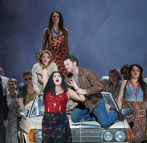 Nun also kein Sevilla, keine Folklore und kein Ausstattungsglanz. Wir sind irgendwann und irgendwo in der schäbigen Pampa, in einer Grenzregion auf einer leer geräumten und immer wieder eingenebelten Bühne mit eher schäbigen Kostümen, die Mercè Paloma erdacht hat: Eine Telefonzelle, ein Fahnenmast und mehrere Oldtimer der Marke Mercedes, mit denen gefahren, in denen gesoffen und die aber auch immer bis aufs Dach wieder bestiegen werden, das ist alles. Zudem noch eine im Hintergrund aufgestellte, später umfallende Plakatwand, einen Stier darstellend. Das Bühnenbild stammt von Alfons Flores. Es herrscht brutale Gewalt, auch unter den Soldaten und den Mädchen und zwischen beiden Gruppen. Die Telefonzelle wird geplündert, Mädchen werden begrapscht, Kinder spielen nicht, sondern betteln. Ein trostloses Ambiente. So ist bei der Premiere in der leeren Wiener Staatsoper, wo nur einige wenige auserwählte Journalisten zugelassen sind, also eine verrohte, brutale Welt zu erleben. Und bald fragt man sich, was ist an dieser szenisch wenig inspirierten Inszenierung so besonders, dass man sie in Wien unbedingt zeigen muss. Sie stört nicht, sie empört nicht, sie besitzt aber auch nicht das gewisse Etwas. Zumindest erzählt Bieito, und das muss man ihm attestieren, die Geschichte, so wie sie ist.