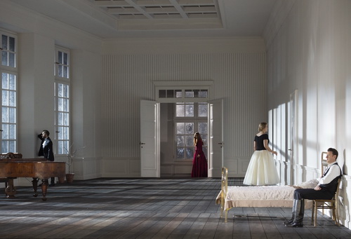 Regisseur Christof Loy, der Meister der Tiefenpsychologie, verzichtet in seiner Inszenierung auf jegliches Rittertum, auf mystische Naturstimmung und Butzenscheibenromantik. Er fokussiert wie fast immer auf die seelischen Vorgänge der Protagonisten, ihre innere Zerrissenheit mit sparsamer Bewegung, aber kleinen Gesten und bedeutsamen Blicken, die alles offenlegen. Das alles wird in dem bei ihm schon bekannten, länglichen, weißen, fast leeren, mit nur einem Bett und einem Klavier als symbolträchtige Versatzstücke ausgestatteten Trichterraum, den Johannes Leiacker schuf, in heutigen eleganten Kostümen von Judith Weihrauch zum Seelenlabor der Gefühle.