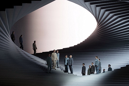 Und da beeindruckt gleichmal die geschwungene, ineinander verwobene, Treppenlandschaft, die ins Unendliche zu führen scheinen. Sie strahlt eine kühle, abstrakte Ästhetik aus und wurde vom amerikanisch-deutschen Architekturbüro Barkow Leibinger entworfen. Die Treppen wirken aber auch wie Schneckenhaus, symbolträchtig wie ein Kerker, in dem derzeit die gesamte Welt gefangen zu sein scheint. Vor dem musikalischen Start wird gleich einmal Florestan von oben die Treppen hinuntergestoßen, und er fällt tief. Erst dann setzt man mit der Leonoren-Ouvertüre Nr. 3 ein. Eigentlich wird nicht die Urfassung Leonore aus 1805 und auch nicht der heute übliche Fidelio aus 1814 gespielt, sondern die von Beethoven geschaffene, so genannte Zweitfassung aus 1806, die auch hier am Theater an der Wien am 29.3.1806 erstmalig gezeigt wurde. Und sie wurde mit einigen zusätzlichen Arien aus anderen Fassungen, etwa Roccos Goldarie angereichert, dafür wurden die Dialoge stark reduziert oder teils stark verändert.