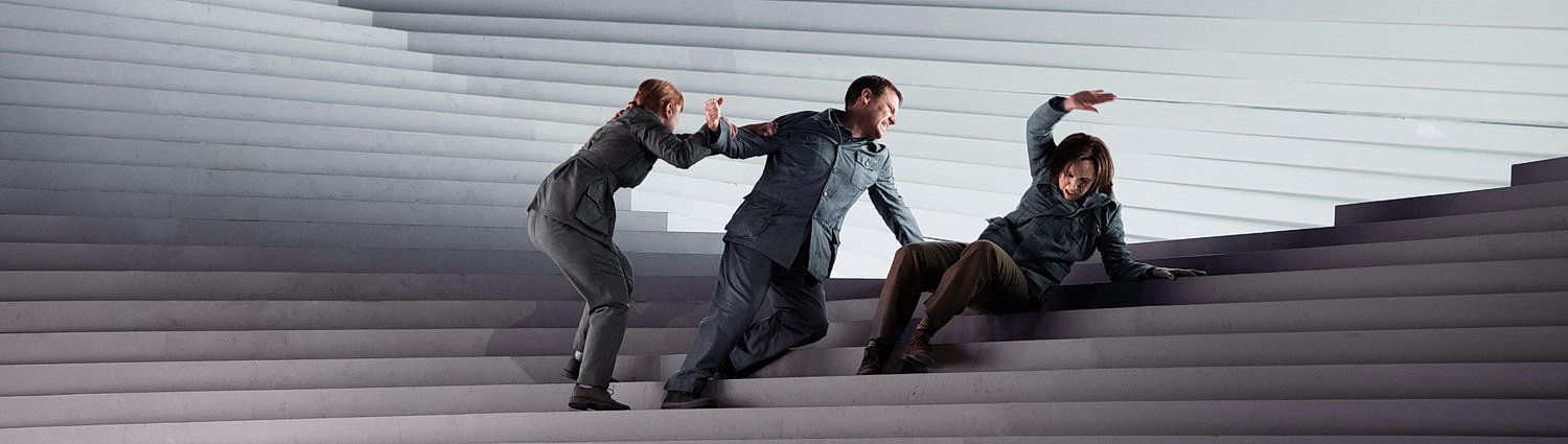 Und da beeindruckt gleichmal die geschwungene, ineinander verwobene, Treppenlandschaft, die ins Unendliche zu führen scheinen. Sie strahlt eine kühle, abstrakte Ästhetik aus und wurde vom amerikanisch-deutschen Architekturbüro Barkow Leibinger entworfen. Die Treppen wirken aber auch wie Schneckenhaus, symbolträchtig wie ein Kerker, in dem derzeit die gesamte Welt gefangen zu sein scheint. Vor dem musikalischen Start wird gleich einmal Florestan von oben die Treppen hinuntergestoßen, und er fällt tief. Erst dann setzt man mit der Leonoren-Ouvertüre Nr. 3 ein. Eigentlich wird nicht die Urfassung Leonore aus 1805 und auch nicht der heute übliche Fidelio aus 1814 gespielt, sondern die von Beethoven geschaffene, so genannte Zweitfassung aus 1806, die auch hier am Theater an der Wien am 29.3.1806 erstmalig gezeigt wurde. Und sie wurde mit einigen zusätzlichen Arien aus anderen Fassungen, etwa Roccos Goldarie angereichert, dafür wurden die Dialoge stark reduziert oder teils stark verändert.
