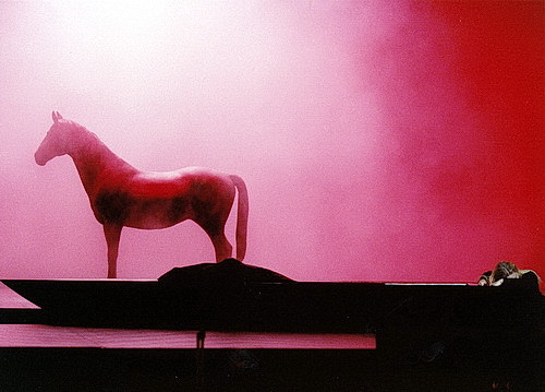 Das Nornen-Vorspiel beginnt sehr düster in einem kleinen Nadelwald, es ist fast dunkel auf der Bühne, die Nornen tragen schwere, schwarze Kleider, wie sie zur Entstehungszeit des Werkes üblich waren. Sie berichten vom Untergang der Natur, von der gefällten Weltesche und dem Versiegen des heiligen Quells. Es herrscht also nicht nur Dunkelheit, es ist auch eine apokalyptische Weltuntergangsstimmung, quasi eine Dystopie allerorten. Passend zu dieser düsteren Stimmung ertönen aus dem Orchestergraben die ersten Verspieler im Blech, was sich fast leitmotivisch den ganzen Abend wiederholt und am Schluss fast nicht mehr zählen lässt. Es ist kein hehres Paar da auf dem Walkürenfelsen, denn Siegfried kann Brünnhildes Dimension nicht erfassen. Und so will er nach einer Liebesnacht auf dem Felsen weg zu neuen Taten. Der Walkürenfelsen, fast wie ein Altar von der Unterbühne emporkommend, ist nur für einen Moment Stätte des Glückes von Brünnhilde und Siegfried. Die schon vom Nornen-Vorspiel bekannten, kleinen Tannenbäumchen wirken hier wie eine Baumschule, die je nach Lichtprojektion grün oder rot leuchten. Hinter einem großen Zaun sieht man die Silhouette eines projizierten Pferdes. Es ist Grane, das Brünnhilde Siegfried als treuen Begleiter auf seine Reise mitgeben wird. Brünnhilde wird am Schluss Siegfried erlösen, und der Welt die Hoffnung auf eine neue Zukunft geben. Die Gibichungen sind die typischen Repräsentanten einer dekadenten, neureichen und oberflächlichen Gesellschaft, die keine Werte kennt. Gunter ist ein Schwächling, der nur durch Äußerlichkeiten zu glänzen weiß. Gutrune erscheint Anfangs einfältig, entwickelt sich aber zum Schluss zu einer liebenden Frau. Berührend ist die Szene im dritten Aufzug, als sie sich neben Brünnhilde zum Leichnam Siegfrieds hinstellt und verunsichert ist, ob sie ihn ebenfalls zärtlich zudecken darf. Als Brünnhilde ihr Zögern bemerkt, ermuntert sie ihre vermeintliche Nebenbuhlerin, indem sie sie schon fast zärtlich in die Arme nimmt. Hier sind zwei vom Schicksal getroffene Frauen vereint in der Trauer um den Geliebten. Es ist einer der seltenen Momente dieser Inszenierung, die berühren, ja, schon fast ans Herz gehen.
