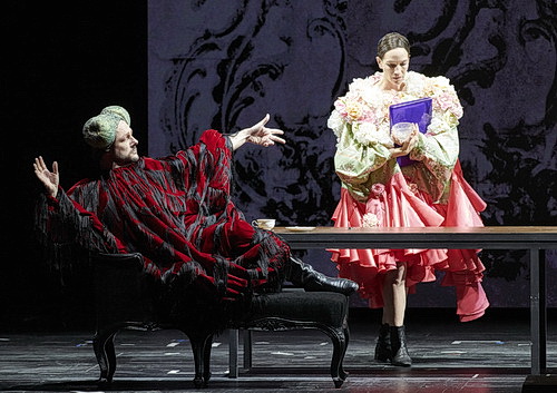 Erzählt wird die Geschichte vom jugend­haften Helden Orlando in 19 Bildern, der 1598 als junger ungestümer Mann Königin Elizabeth I begegnet. Während des großen Frosts 1610 in London verweigert sich ihm die attraktive Sasha. Orlando zieht sich bedrückt zurück und wird zum Schrift­steller. Das Schreiben wird zum wesent­lichen Inhalt des Romans. Gräuel und Krieg lassen ihn in einen langen Schlaf fallen, aus dem er als Frau erwacht. Die rechtlose, nicht respek­tierte Frau erlebt im vikto­ria­ni­schen Zeitalter die repressive soziale Atmosphäre und kämpft um ihre Rechte als Frau und später für die Kinder. Nach dem Ende des Romans sackt die Drama­turgie ab und die Erzählung wird nur mehr zu einem langge­zo­genen, verkrampften gesell­schafts­po­li­ti­schen Statement. Roy Span gestaltet eine Bühne ohne Kulissen mit wenigen Requi­siten. Wesent­lichen Eindruck hinter­lassen die Video­ein­spie­lungen mit stimmungs­vollen Landschafts -, Farb‑, Regen- und Schnee­auf­nahmen. Dabei hängen einige Leinwand­panele von der Bühnen­decke und werden wie Vorhänge verschoben. Phanta­sievoll bunt und geradezu abenteu­erlich voluminös sind die Kostüme und Masken von Rei Kawakubo, angepasst an die verschie­denen Jahrhun­derte. Die Perso­nen­regie hinter­lässt wenig Eindruck auf einer zumeist vollbe­setzten und vollge­stellten Bühne. Und immer wieder tanzt ein überdi­men­sio­naler Zeitkreisel als Projektion bei den Szenen­über­gängen und führt durch die Jahrhunderte.
