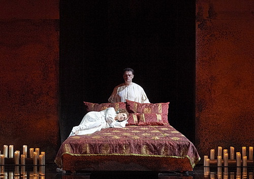 Wenn auch das Schlussbild mit den Unmengen von Kerzen, den sanften Lichtstimmungen und dem einnehmenden Bett für ein gewisses Maß an stimmigen Emotionen sorgt, so wirkt der Rest der Ausstattung mit der optischen Dominanz der beiden kahlen Wände und der beiden beweglichen, kupferfarbigen Säulen, die Bühne stammt von Dick Bird, eher desillusionierend. Dieses abstrakt-monochrome Ambiente hätte man noch irgendwie akzeptieren können, wenn es mit entsprechendem Leben erfüllt worden wäre. Das ist aber nicht der Fall. Zudem verlegt der Regisseur die Geschichte aus unerfindlichen Gründen in entsprechend altväterlichen Kostümen noch vom 15. Jahrhundert in den Anfang des 20. Jahrhundert. Ein Grund dafür erschließt sich nicht. Eine Neudeutung sucht man ebenso vergebens. Und so beobachten gleich zu Beginn Frauen mit schwarzen Häubchen und Männer in Gehröcken und Zylindern den Sturm und den Kampf des Schiffes an der Küste. Aber auch alles weitere wirkt irgendwie sehr konventionell, bleiern. Und das Schlimmste: Es packt einfach viel zu wenig.